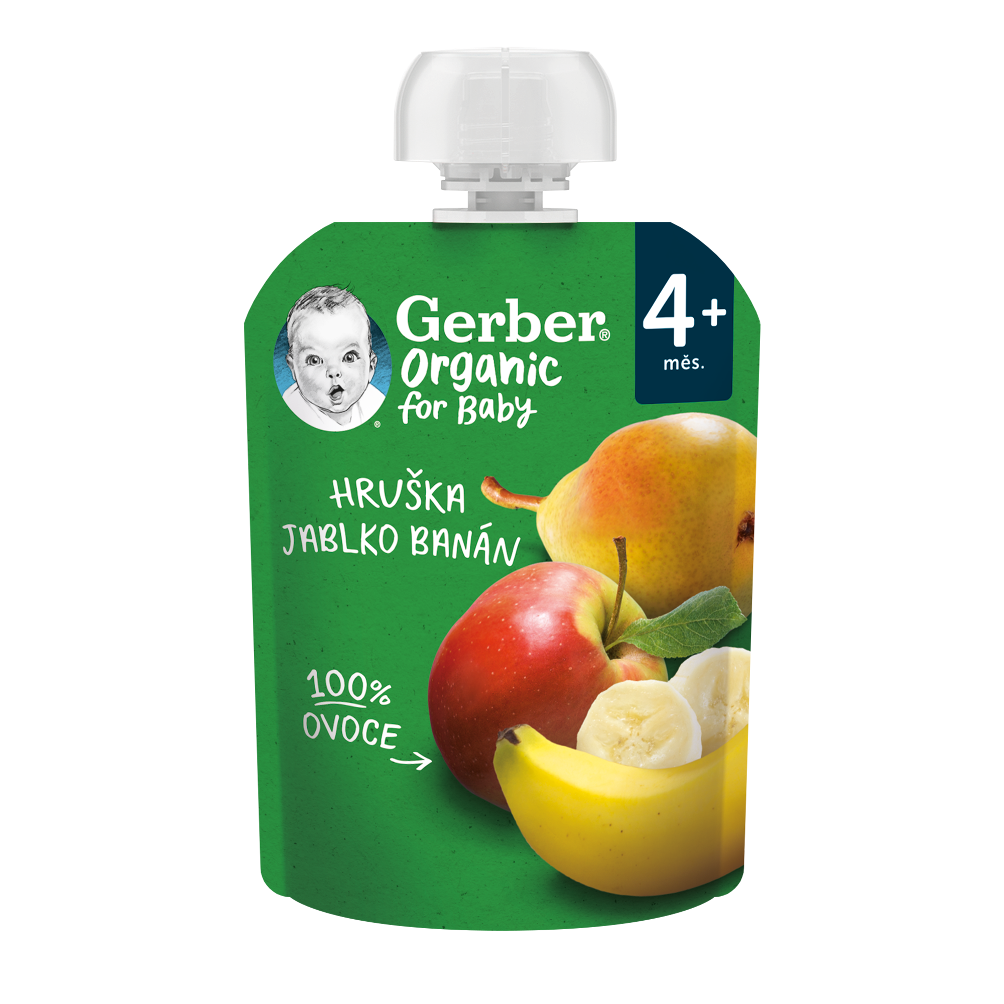 GERBER Organic kapsička hruška, jablko a banán je vyrobená z nejkvalitnějšího ovoce. Kapsička obsahuje pyré ze zralých kousků hrušky, jablka a banánu a kapku citronové šťávy. Váš malý jedlík má tak vynikající chuť ovoce na dosah ručičky. GERBER Organic stejně jako maminka dohlíží na to, aby každá kapsička obsahovala jen to nejlepší ovoce plné opravdové chuti.