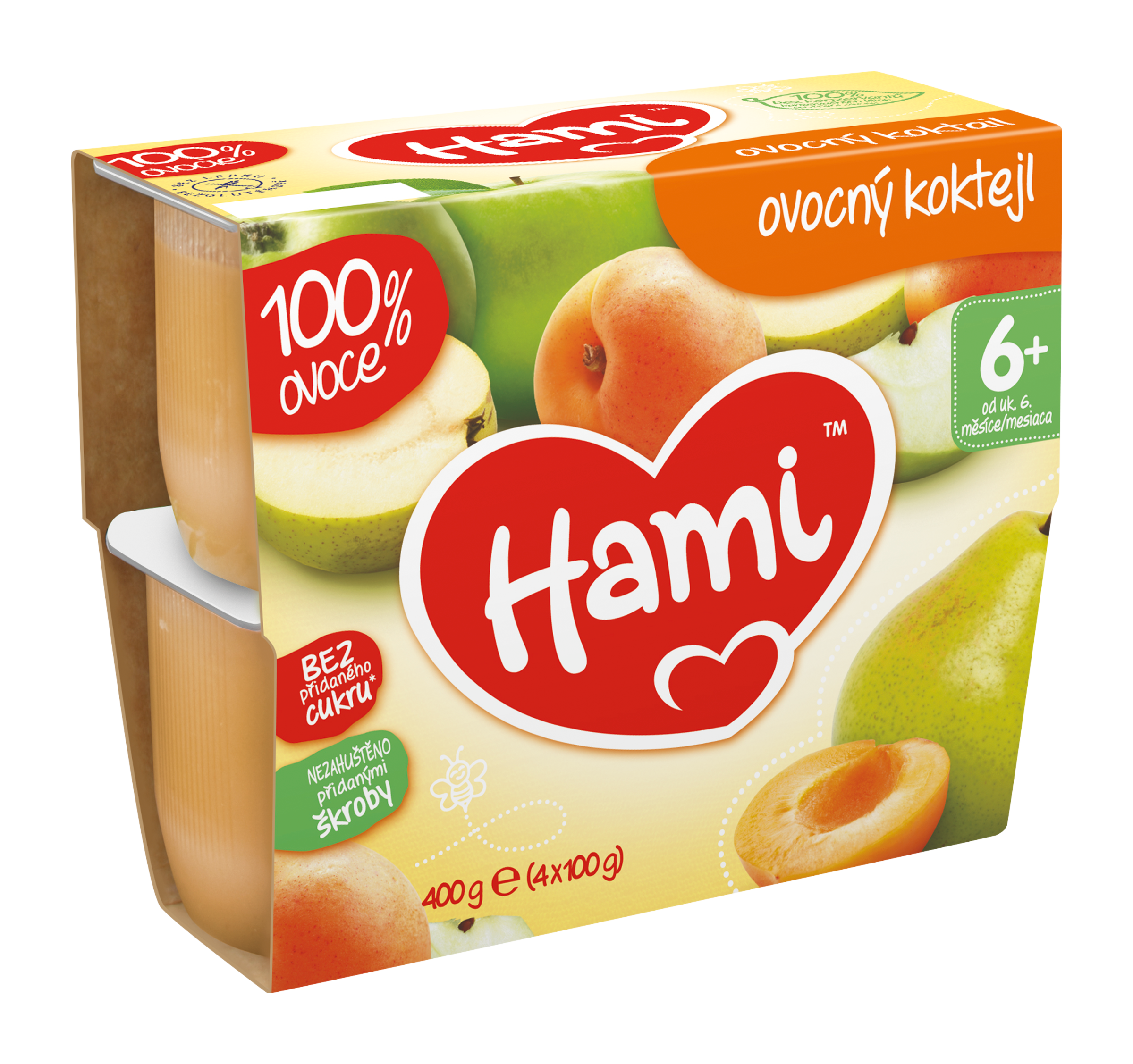 Hami ovocná přesnídávka je lehká a chutná svačinka pro miminko od ukončeného 6. měsíce. Je vyrobená z nejkvalitnějšího ovoce, bez přídavku cukru* a bez konzervantů.** Každý kelímek obsahuje 3/4 jablka, plátek hrušky, 1/3 meruňky, 2 plátky banánu. Ovoce bylo navíc sklizeno ručně.