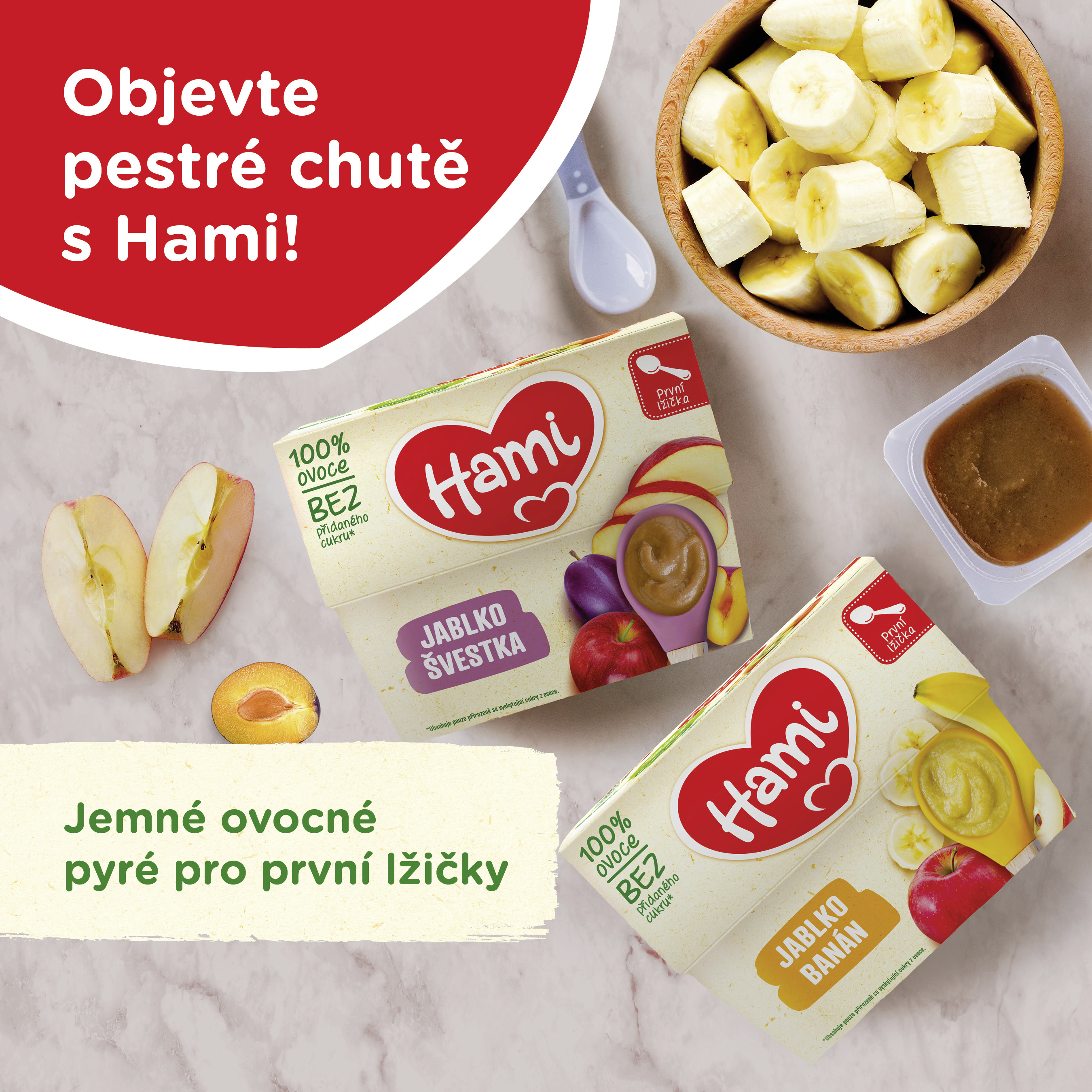 Hami 100% ovoce je lehká a chutná svačinka pro Vaše dítě. Je vyrobená z vysoce kvalitního ovoce, bez přídavku cukru* a bez konzervantů**. Víte, že? Každý kelímek obsahuje 1 jablko a 1/3 banánu. Ovoce bylo navíc sklizeno ručně.