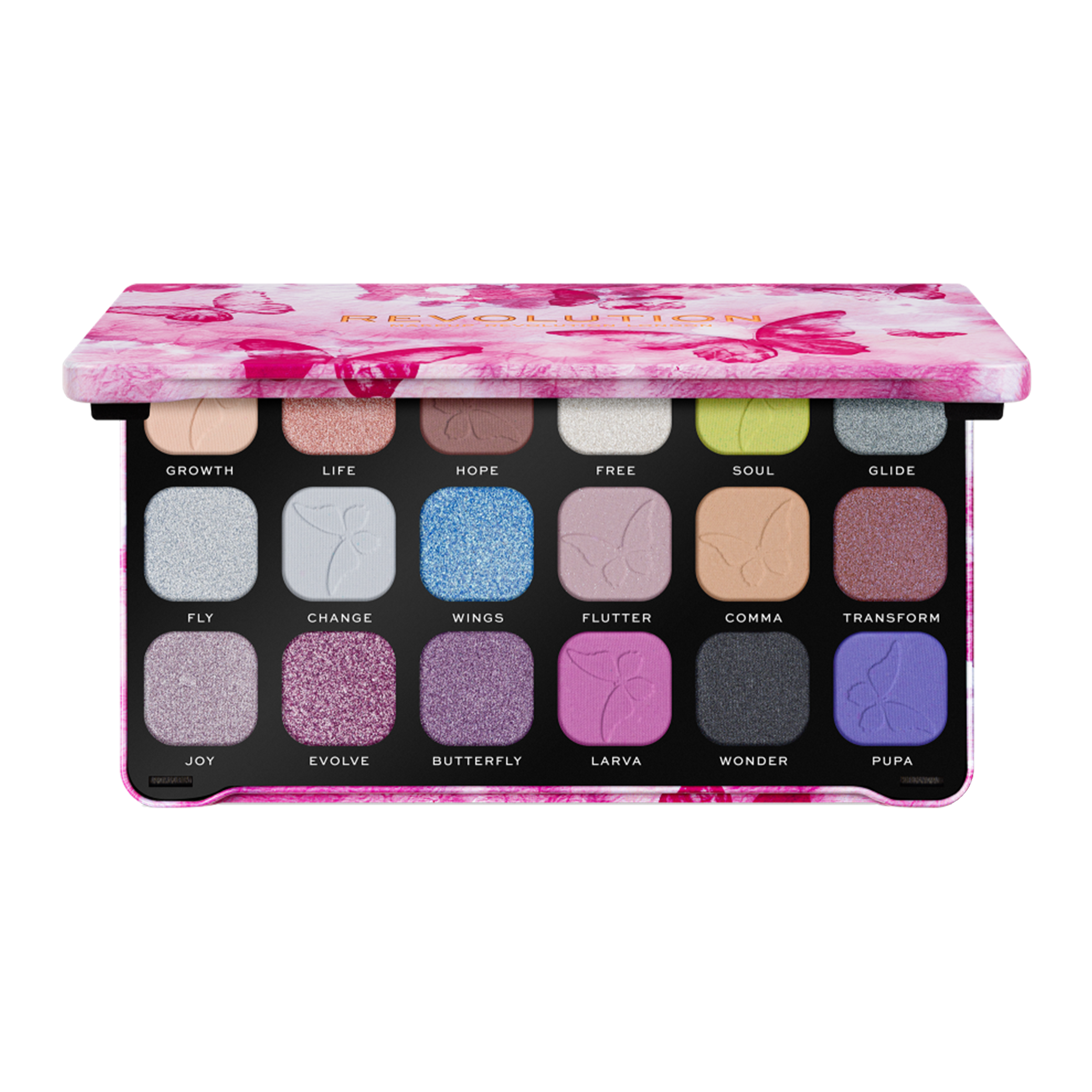 Vytvoř éterický look jako mávnutím motýlích křídel s paletkou očních stínů Forever Flawless Butterfly. Ta obsahuje kombinaci 18 matných a třpytivých odstínů v jemných pastelových tónech od zasněné světle modré až po uchvacující lila fialovou. Doplň svůj vzhled také leskem na rty ze stejné kolekce Revolution Forever Flawless Butterfly, který je v dispozici ve 3 jemných odstínech.