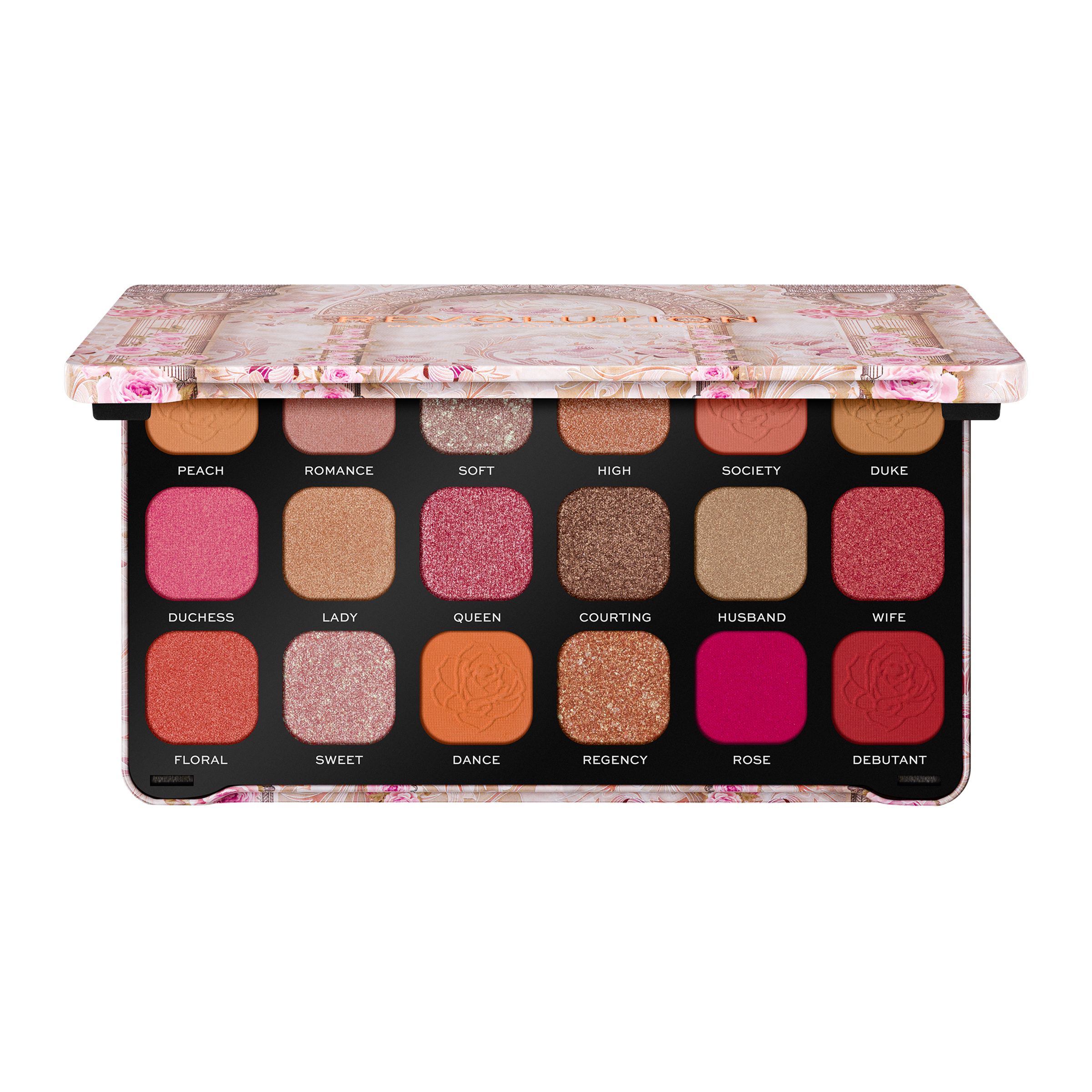 Probuď svou vnitřní KRÁLOVNU s paletkou očních stínů Revolution Forever Flawless Regal Romance Shadow Palette. S 6 matnými teplými tóny a 12 broskvovými a růžovými třpytivými barvami budeš během okamžiku připravena na ples!