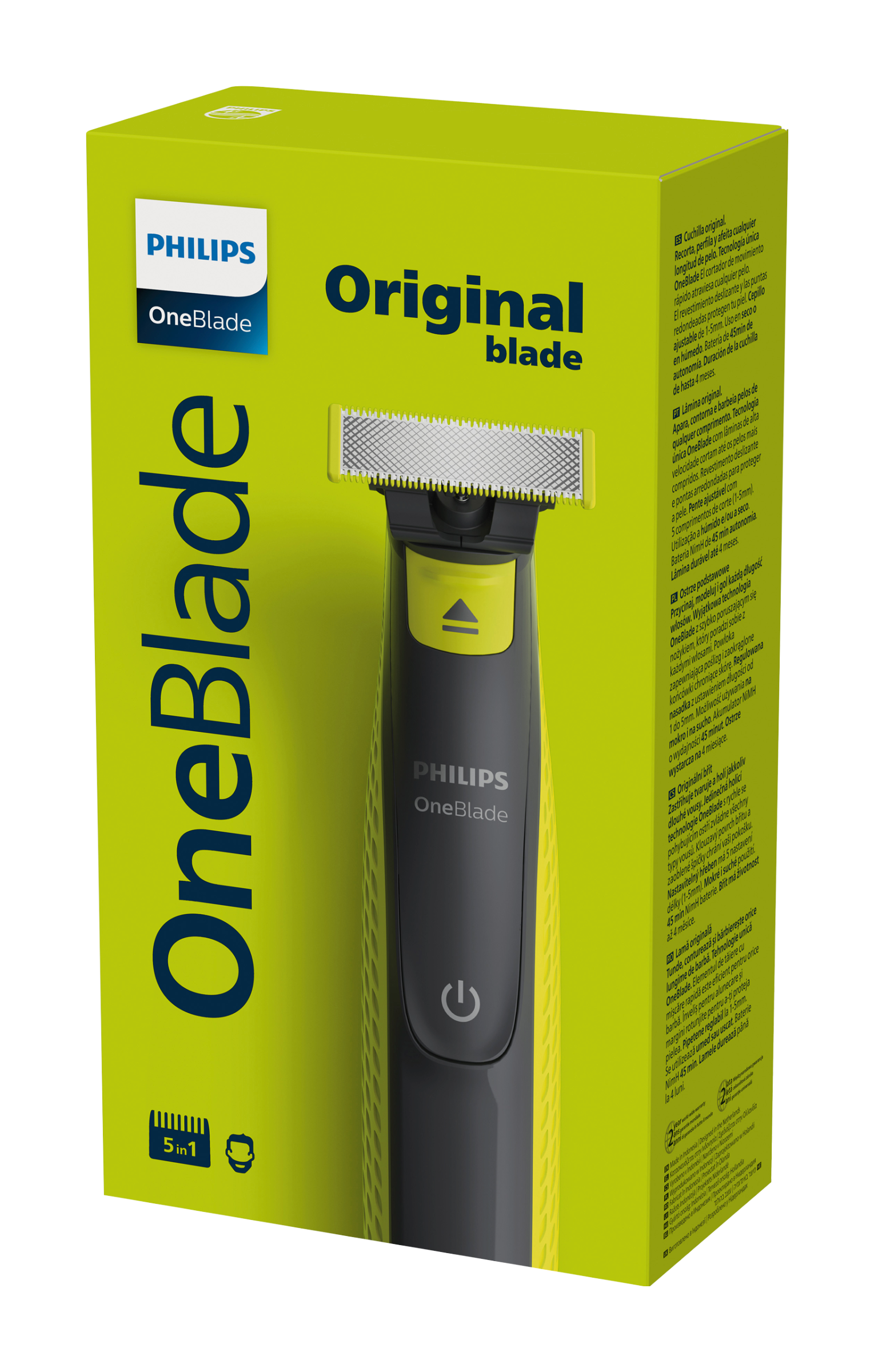 Philips OneBlade zastřihuje - tvaruje - oholí libovolně dlouhé vousy. Oboustranné ostří s dvojí ochrannou před pořezáním, vhodné i pro citlivou pleť. Pro mokré i suché holení. Hřebenový nástavec 5 v 1 pro zastřihování s 5 nastavení délky vousů. Výdrž baterie 45 min / 8 hod nabíjení.