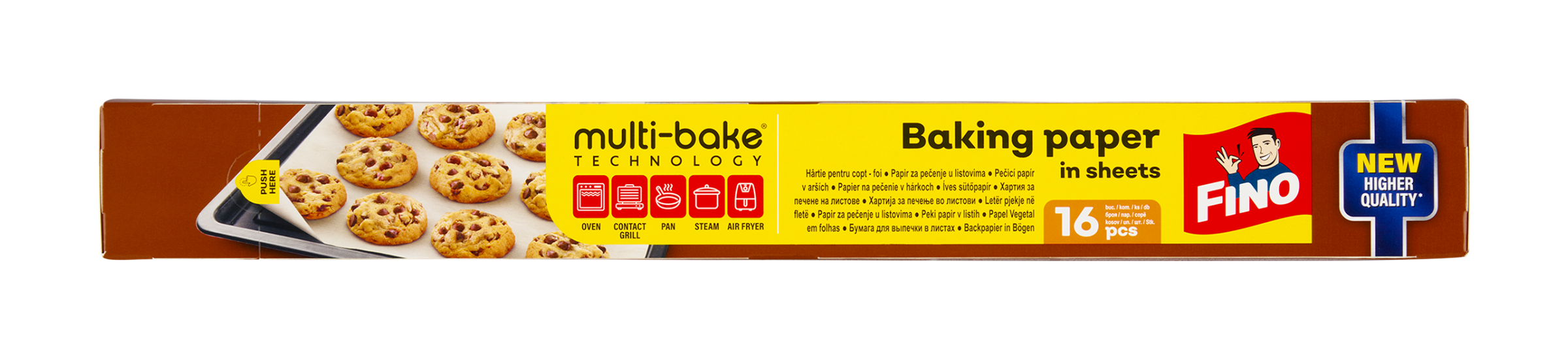 Nový, kvalitnější papír na pečení Fino v arších s technologií Multibake. Vhodný pro trouby, horkovzdušné fritézy, pánve, mikrovlnné trouby, sendvičovače, chladničky a mrazničky. Silikonová vrstva zabraňuje přichycení jídla. Papír lze použít z obou stran. Je bezpečný pro pečení při teplotách do 220 °C a vhodný pro přímý styk s potravinami. Doporučuje se pokrýt vybraným pokrmem minimálně 80 % povrchu pečicího papíru. Dostupný v arších ve velikosti běžných forem/plechů (42 x 38 cm). Nová vyšší kvalita* *Vyšší kvalita ve srovnání s původním pečicím papírem Fino.