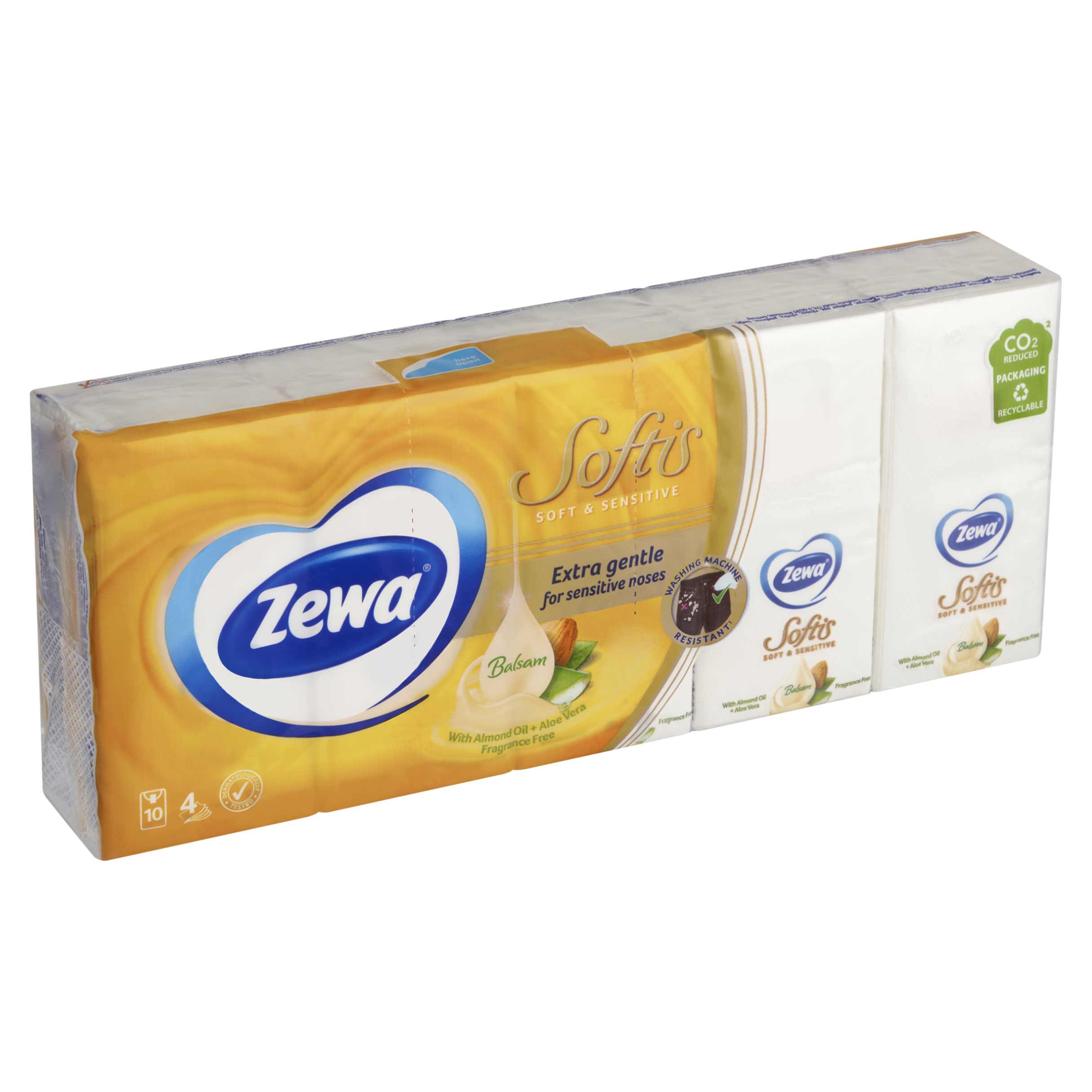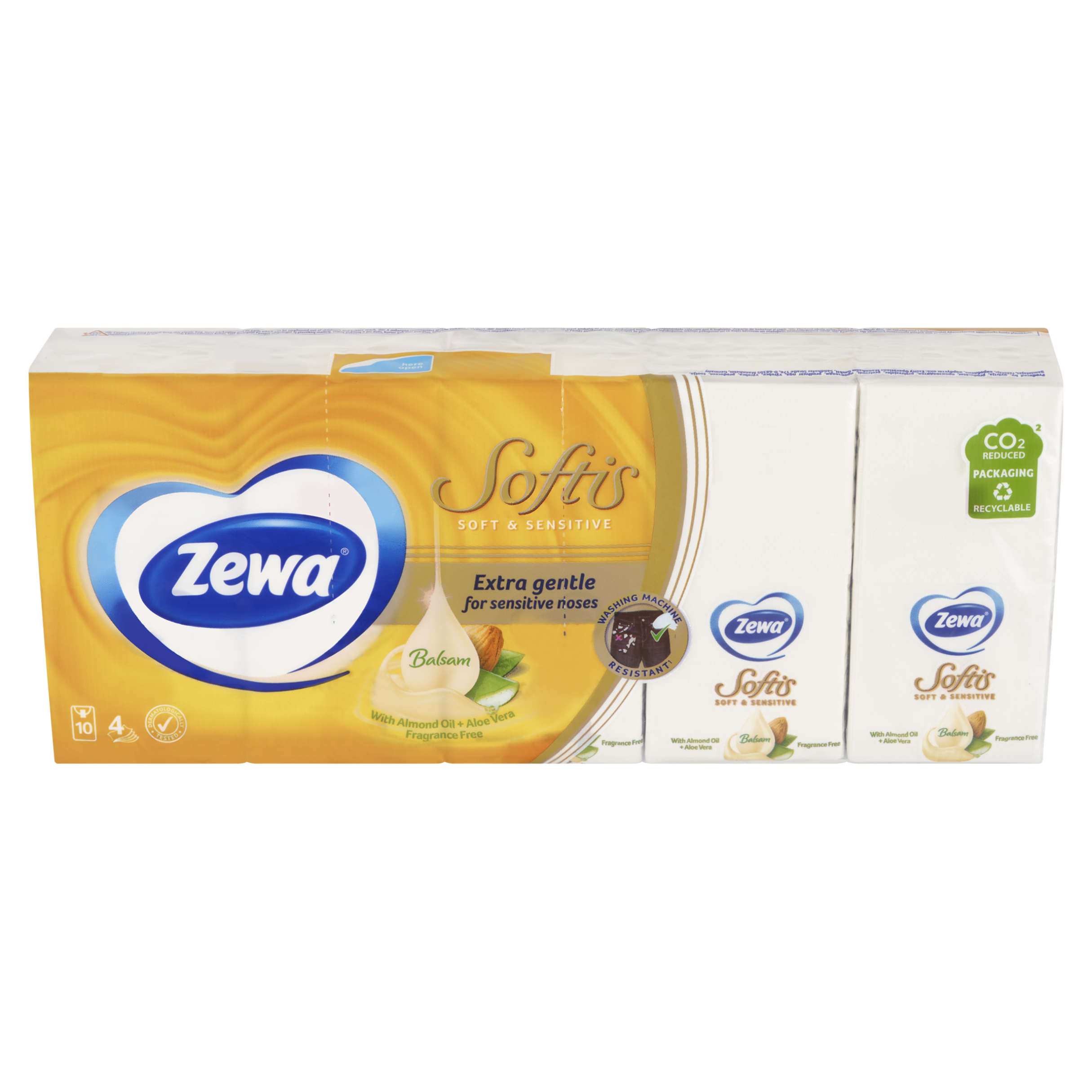 Tyto jemné a šetrné kapesníčky obsahují jedinečnou kombinaci mandlového oleje a Aloe vera, to jim dodává mimořádnou jemnost pro vaši pokožku a zároveň jsou vhodné pro časté používání. Dny zarudlé a podrážděné pokožky kolem vašeho nosu jsou navždy pryč. Čtyřvrstvé kapesníčky zklidňují a ulevují vaší pokožce. Dopřejte svému nosu pocítit ten rozdíl! Pokud kapesníky Zewa omylem vyperete v pračce tak se nemusíte bát, nerozpadnou se, jsou totiž odolné vůči praní, avšak i přesto si zachovávají svou jemnost. Obal produktu je recyklovatelný. Tyto kapesníčky se mohou chlubit certifikací FSC, to znamená, že výrobek pochází ze šetrně obhospodařovaných lesů.