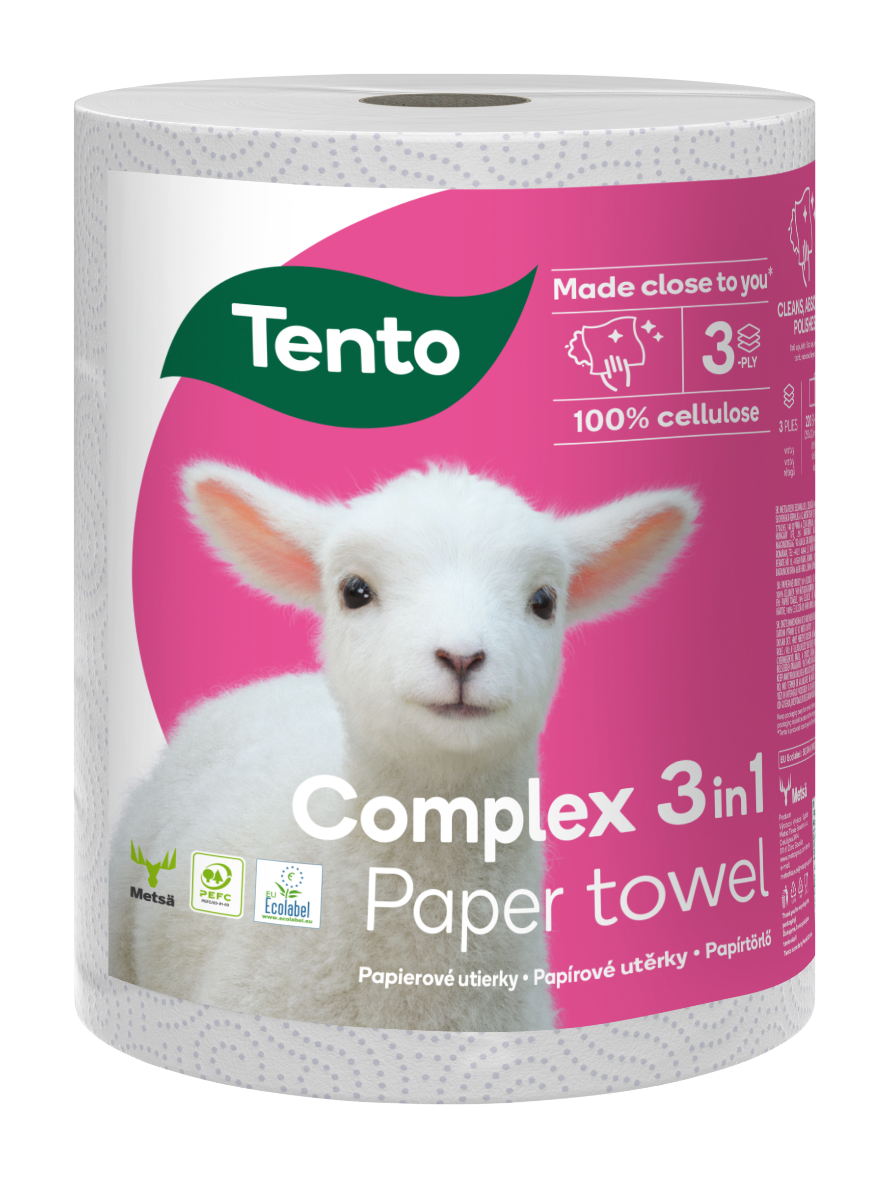 Papírové utěrky Tento Complex patří v sortimentu Tento k utěrkám nejvyšší kvality, určeným pro náročné úkoly vyžadující vysokou pevnost i savost. Díky extra silné 3-vrstvé struktuře a profesionální vrstvě jsou ideální na čištění, sušení a leštění různých povrchů. Ať už jde o běžný nepořádek v kuchyni nebo velký generální úklid, utěrky Tento Complex poskytují spolehlivý výkon s každým útržkem. Každá role vydrží dlouho a zvládne i ty nejnáročnější úkoly. Papírové utěrky jsou vyrobeny blízko vám ze 100% celulózy, což zaručuje stabilně vysokou kvalitu a odolnost. Jejich struktura efektivně zvládá vlhkost a zároveň je jemná na dotek. Papírové utěrky Tento Complex obdržely certifikáty PEFC a FSC, nesou označení EU Ecolabel i symbol sklenice a vidličky, díky čemuž jsou vhodné pro kontakt s potravinami. Jsou nezbytnou součástí domácností, které kombinují profesionální výkon s praktickým využitím. Obal Tento Complex tvoří 100% papírová etiketa a plastová fólie. Celý obal je 100% recyklovatelný.