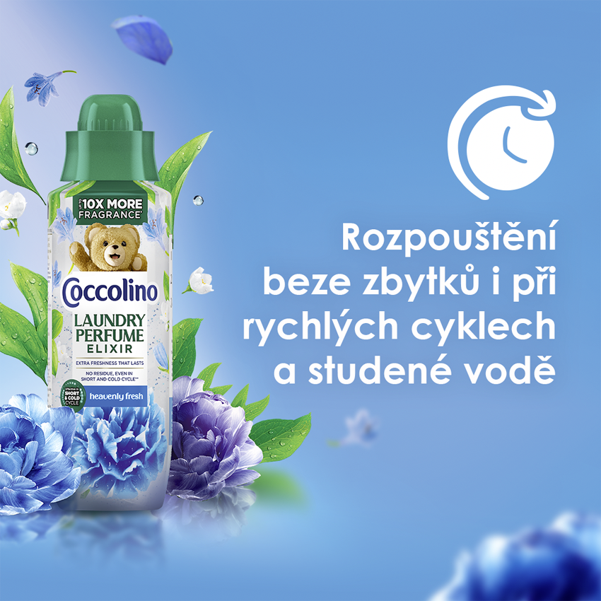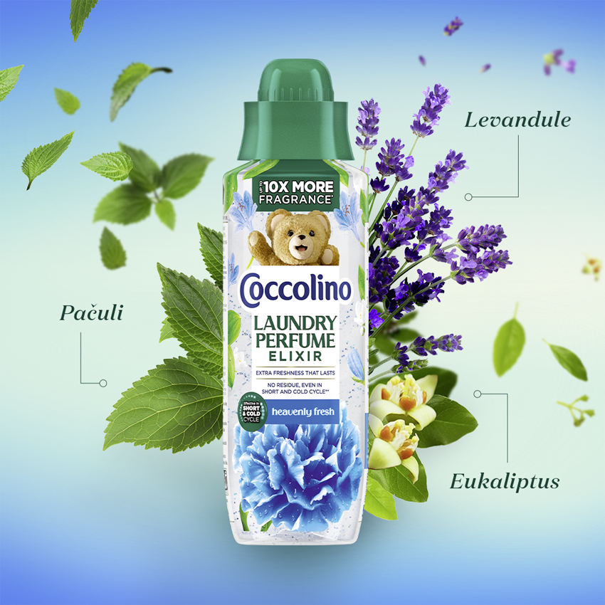 Zažijte až 10x voňavější zážitek s Coccolino parfémem na praní. Coccolino parfém na praní, Heavenly Fresh, pohltí vaše prádlo do vůní pačuli, levandule a eukalyptu.
