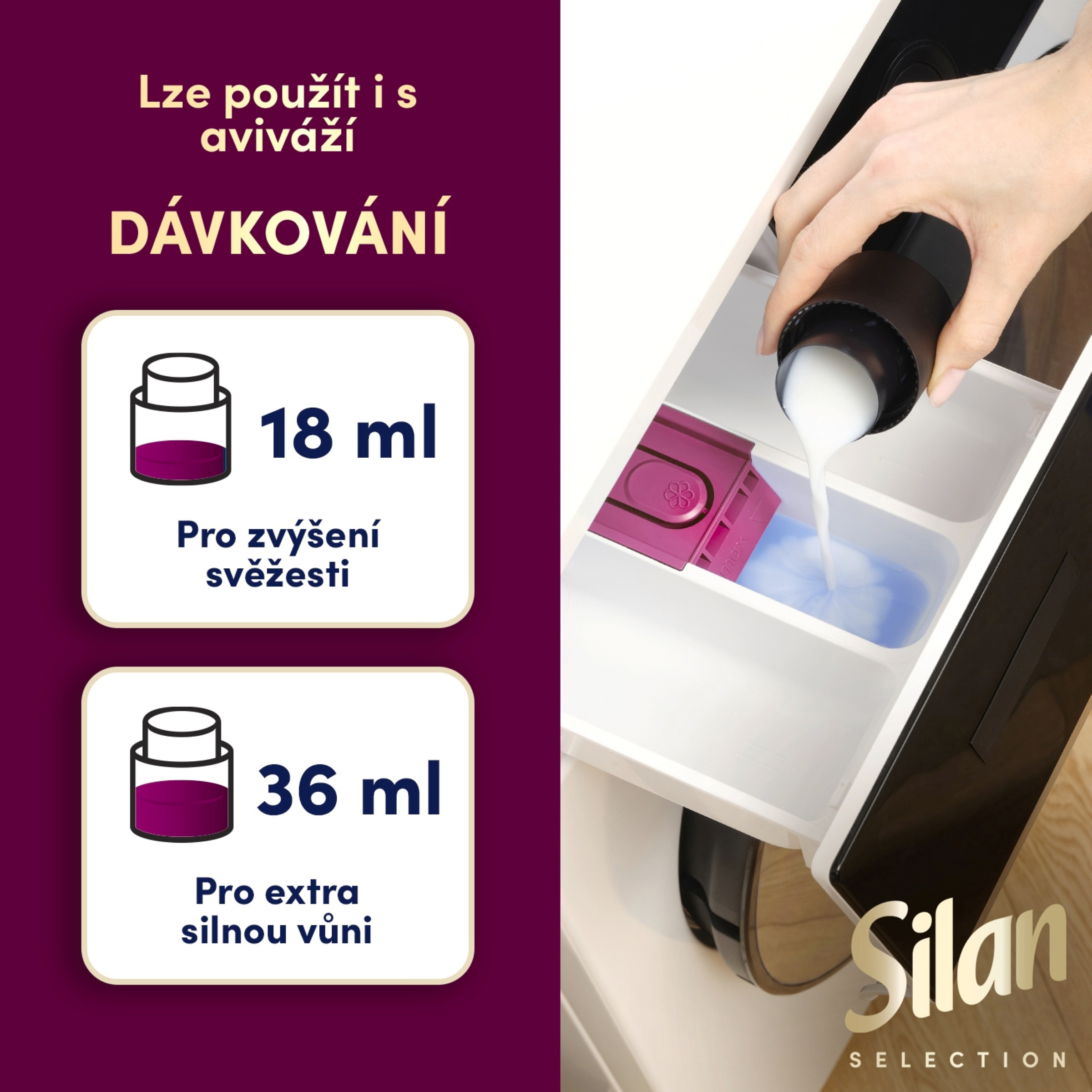Nalijte přímo do přihrádky na aviváž. Vhodné pro standardní i vysoce účinné (HE) pračky. Lze kombinovat s aviváží pro ještě příjemnější pocit hebkosti. Není nutné ředit ani míchat. Dávkování: Použijte 18 ml pro osvěžení vůně, nebo 36 ml pro extra intenzivní zážitek.