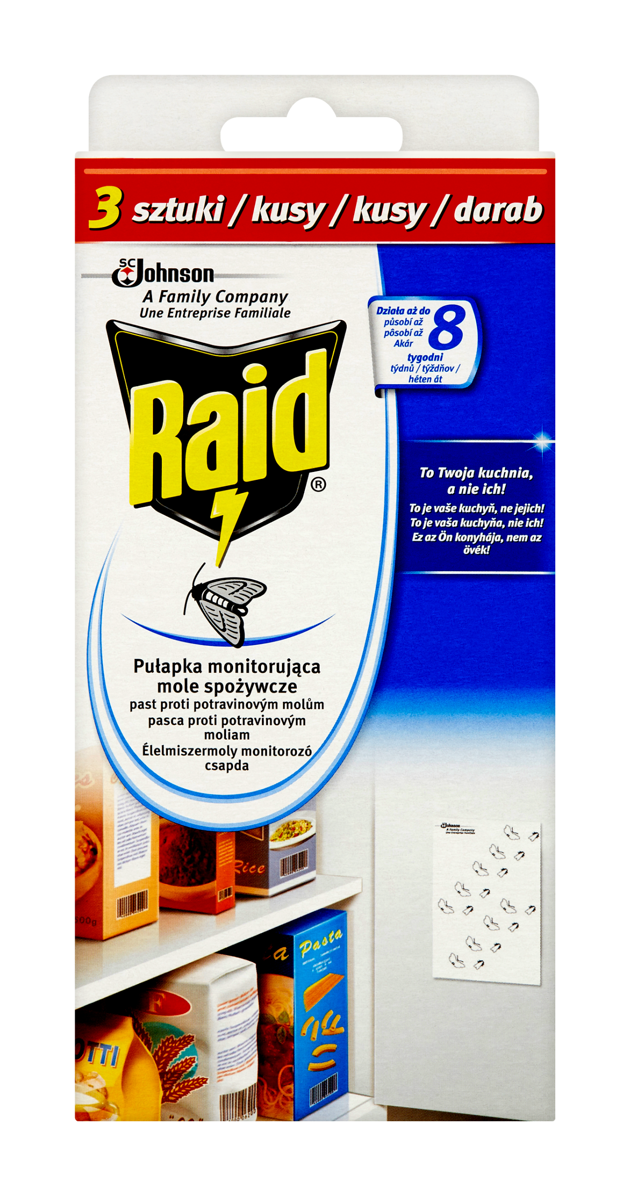Raid® past proti potravinovým molům obsahuje atraktivní látku, která přivábí samčí moly. Jedinci se přilepí na papírový proužek s lepem a tím se odhalí problém před větším zamořením.