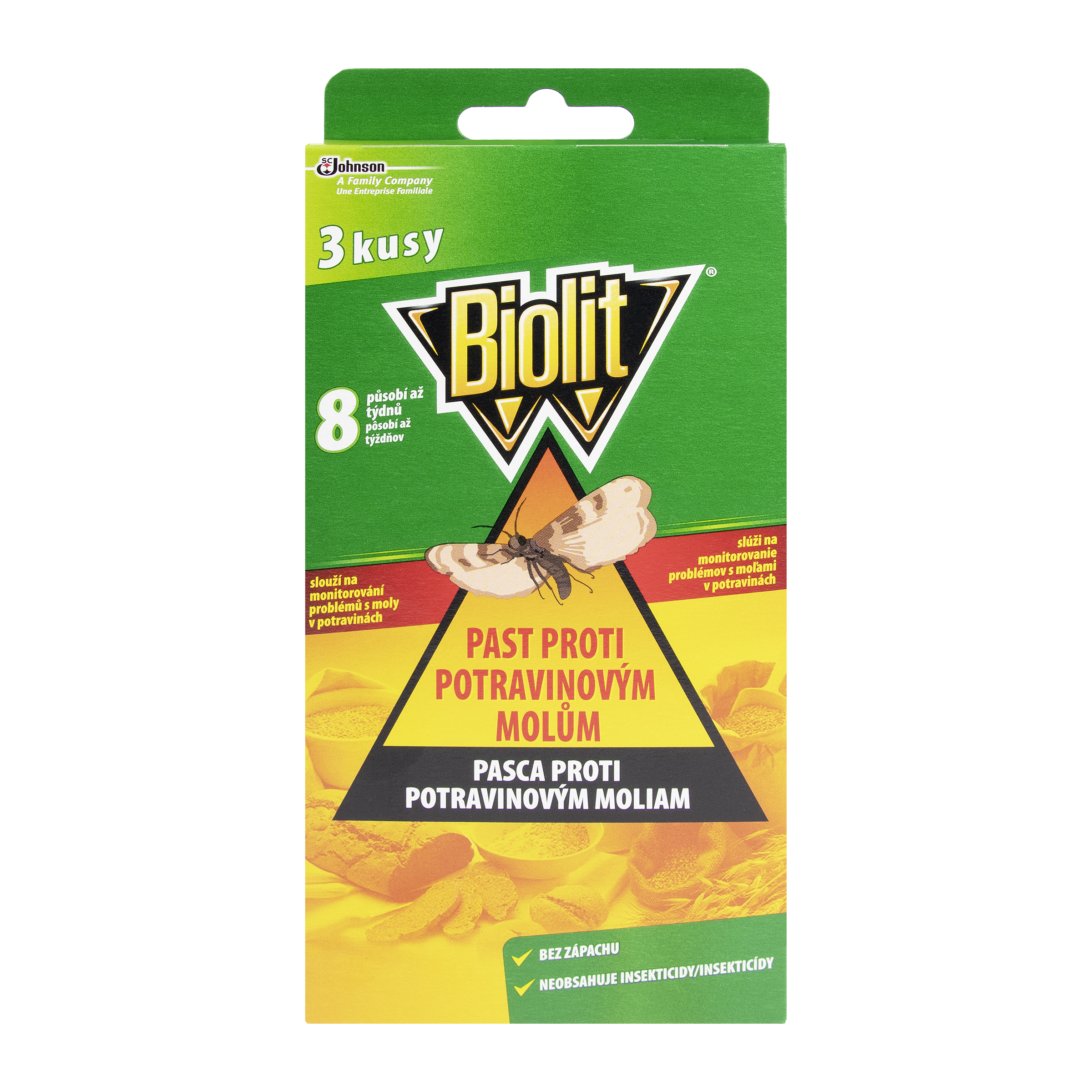Biolit® past proti potravinovým molům obsahuje atraktivní látku, která přivábí samčí moly. Jedinci se přilepí na papírový proužek s lepem a tím se odhalí problém před větším zamořením. Při výskytu většího množství molů použijte vhodný insekticid.