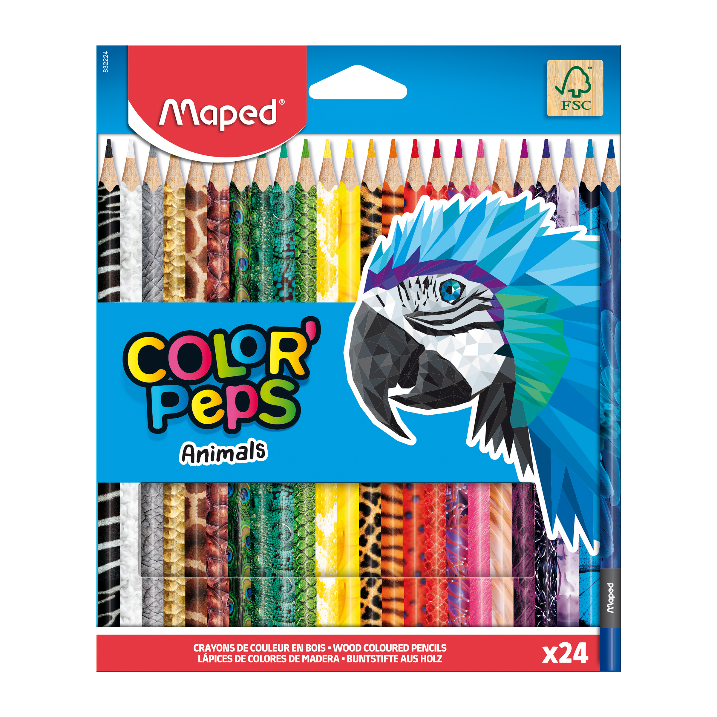 Souprava 24 kusů pastelek v atraktivních zvířecích motivech. Pastelky mají ergonomické trojhranné tělo, měkkou odolnou tuhu o tloušťce 2,9 mm, jasné barvy.
