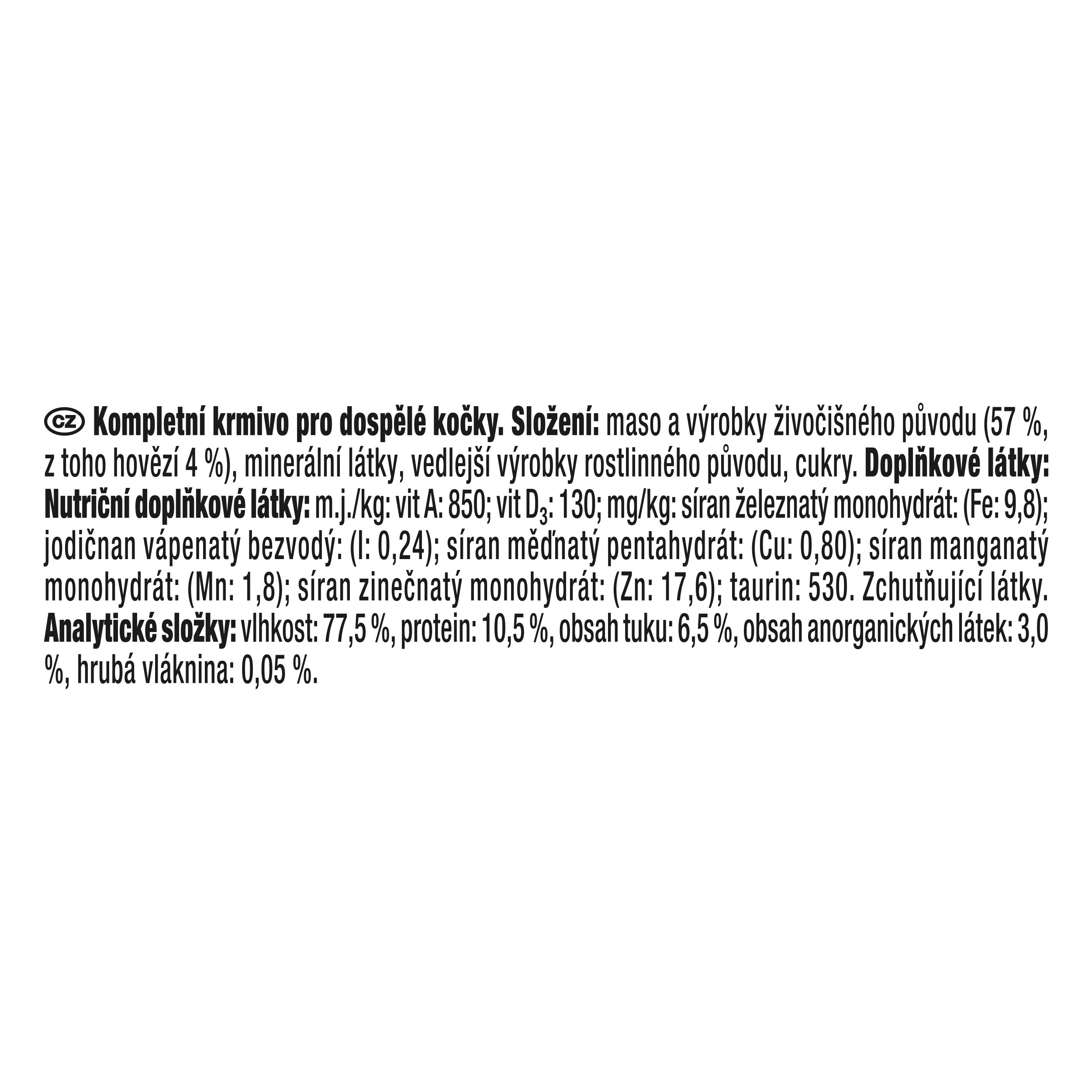 Složení: maso a výrobky živočišného původu (57 % z toho hovězí 4 %), minerální látky, vedlejší výrobky rostlinného původu, cukry.