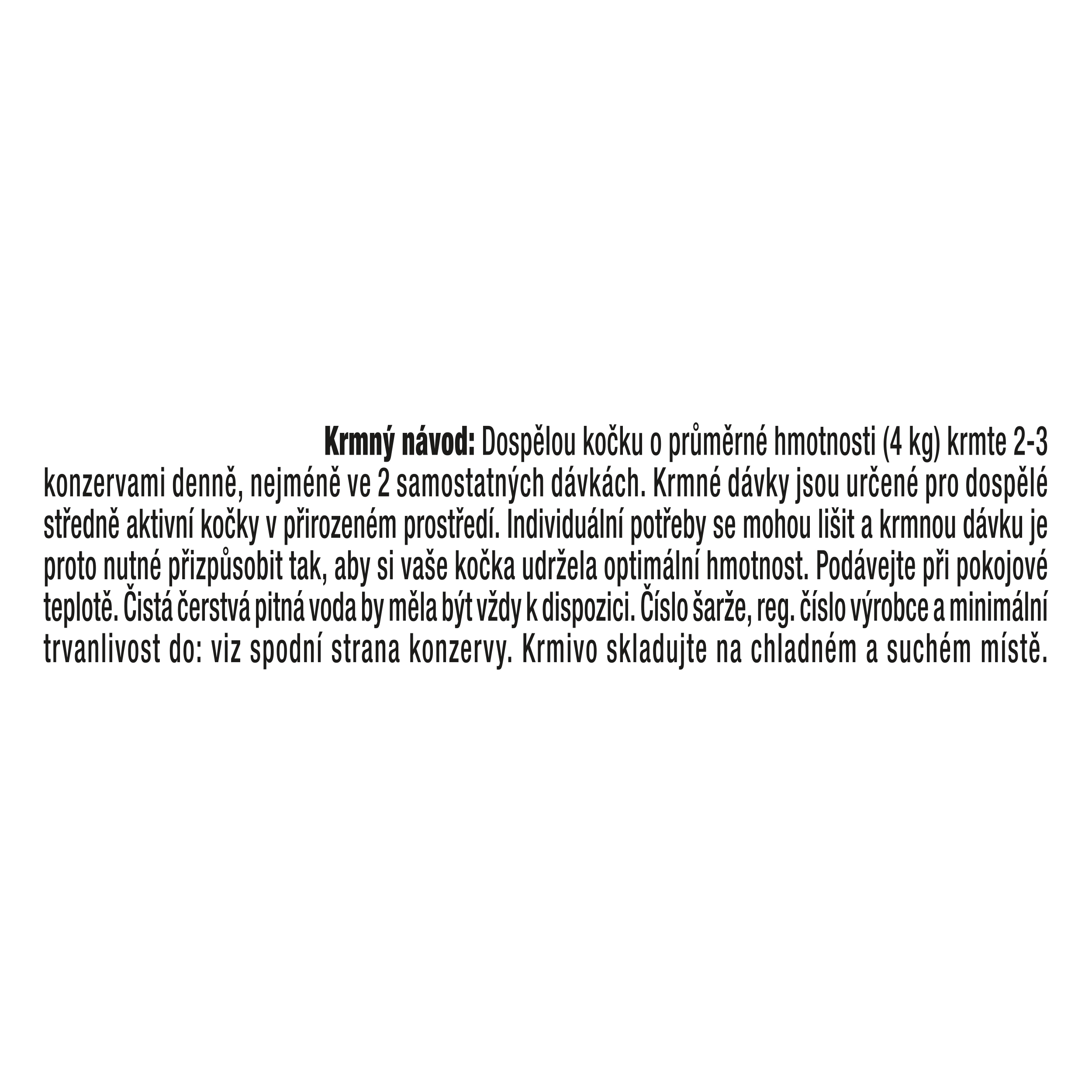 Krmný návod: Dospělou kočku o průměrné hmotnosti (4 kg) krmte 3 až 4 konzervami denně, nejméně ve 2 samostatných dávkách. Krmné dávky jsou určené pro dospělé středně aktivní kočky v přirozeném prostředí. Individuální potřeby se mohou lišit a krmnou dávku je proto nutné přizpůsobit tak, aby si vaše kočka udržela optimální hmotnost. Podávejte při pokojové teplotě. Čistá čerstvá pitná voda by měla být vždy k dispozici.