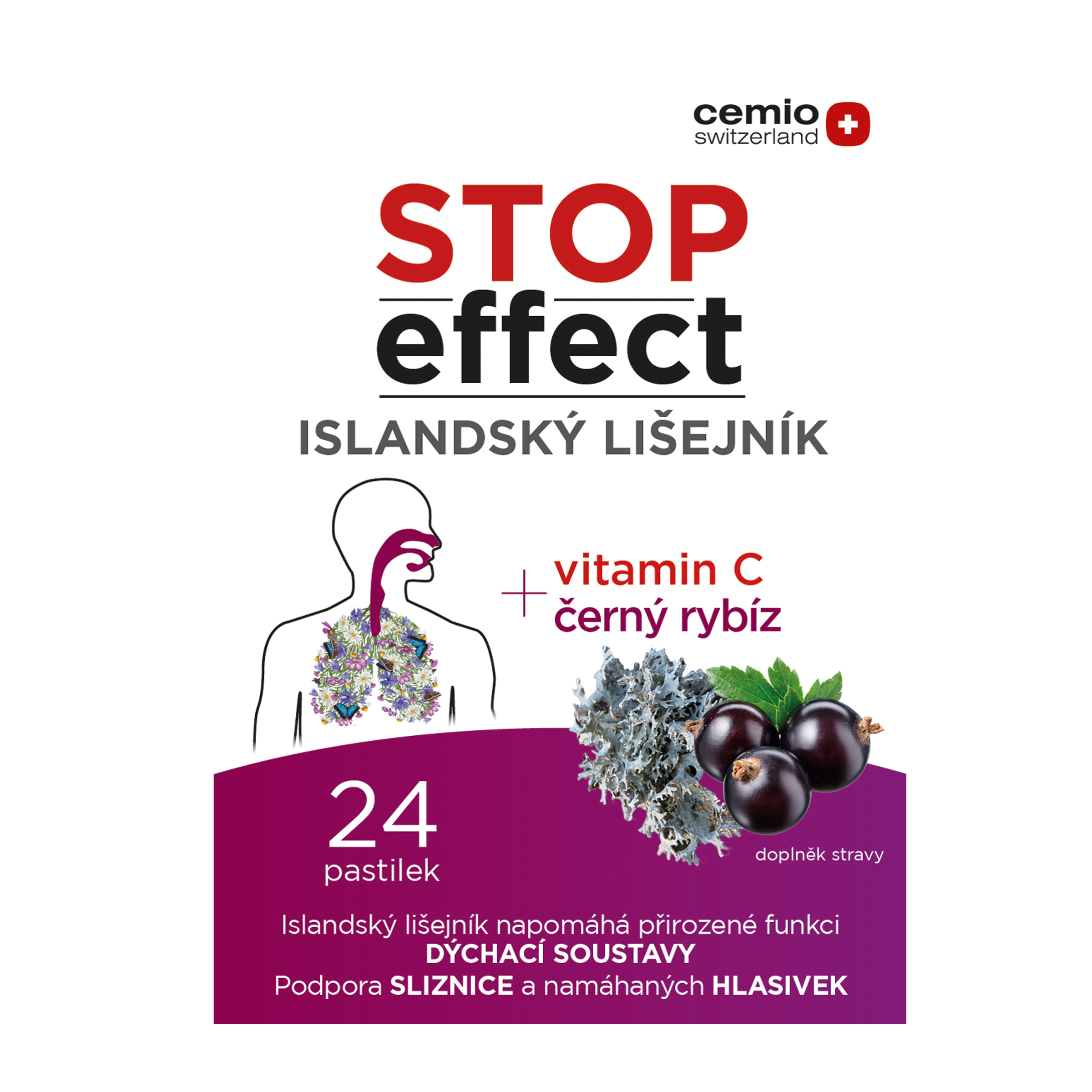Bylinné pastilky s vysokým obsahem extraktu islandského lišejníku s vitaminem C. Při nepříjemných a dráždivých pocitech v ústech, krku či na hlasivkách. Balení obsahuje 24 pastilek s lahodnou příchutí černého rybízu s jemnou chutí lišejníku islandského. Vysoký obsah extraktu islandského lišejníku 80 mg v každé pastilce má uklidňující a příjemný účinek na krk, hltan a hlasivky. Obohaceno o vitamin C, který je přirozeným antioxidantem a přispívá k normální funkci imunitního systému. S lahodnou příchutí černého rybízu s jemnou chutí lišejníku islandského.