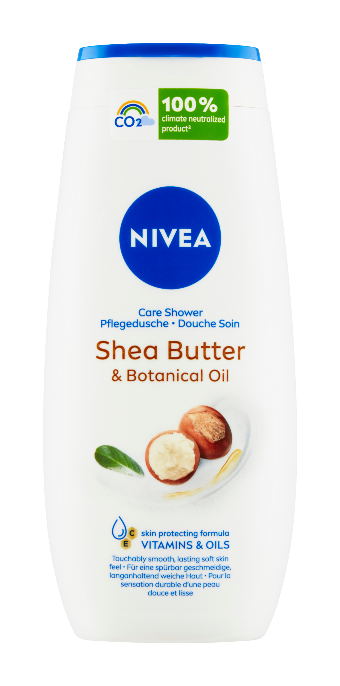 Pečující sprchový gel Shea Butter & Botanical Oil s vitamínem C a E, vzácnými oleji a bambuckým máslem zabraňuje vysušování pokožky. Nenarušuje přirozenou mikrobiální vrstvu pokožky. Klimaticky neutralizovaný výrobek (emise CO₂ jsou kompenzovány pomocí certifikovaných klimatických projektů).