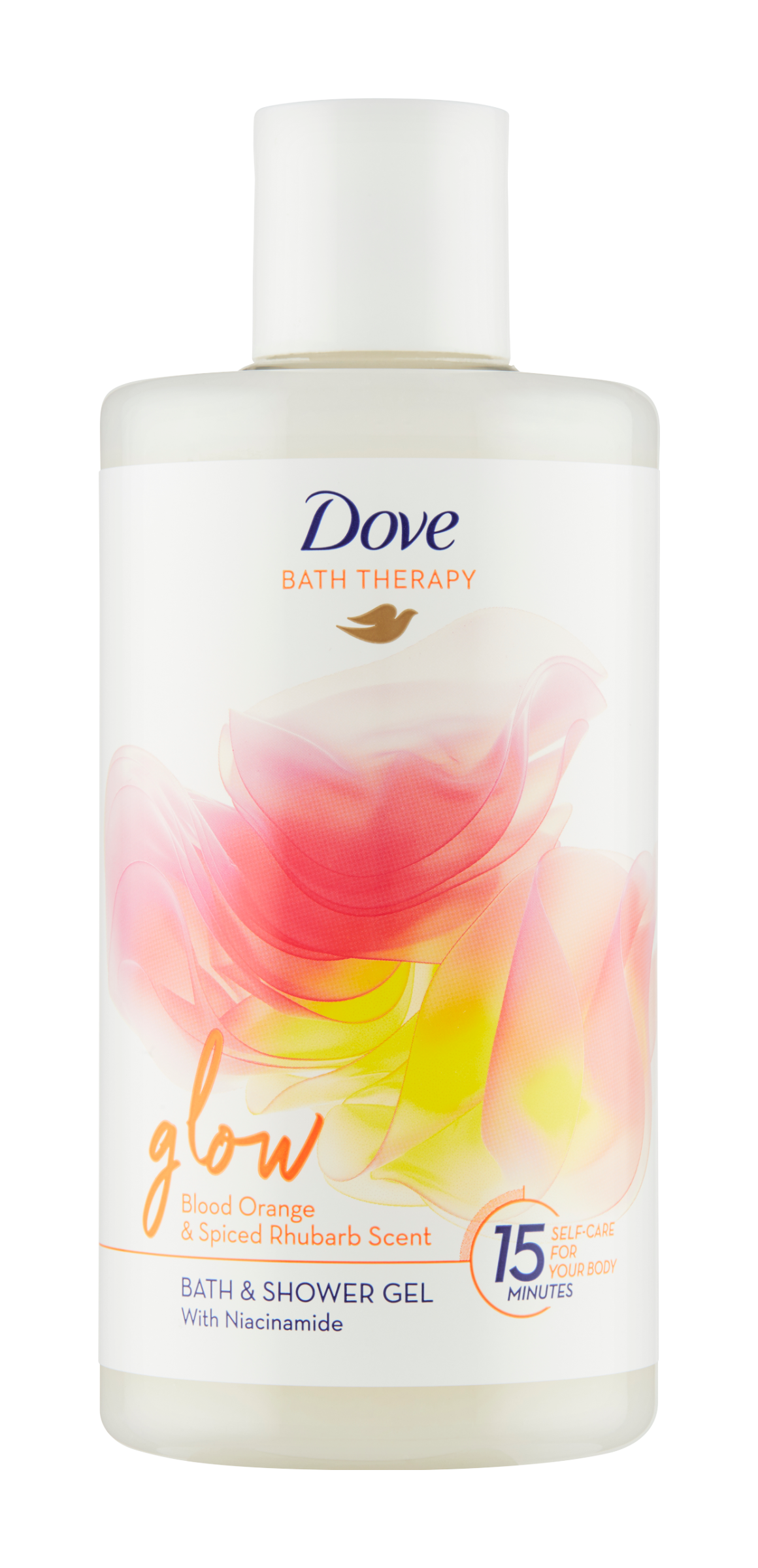 Dopřejte si chvilku relaxace se sprchovým gelem Dove Bath Therapy Glow s vůní červeného pomeranče a rebarbory. Tento gel je zároveň vhodný i pro použití jako pěna do koupele. Řada Glow obsahuje také niacinamid, který je znám jako ""vitamín krásy"". Dopřejte svému tělu 15 minutovou péči s Dove Bath Therapy.