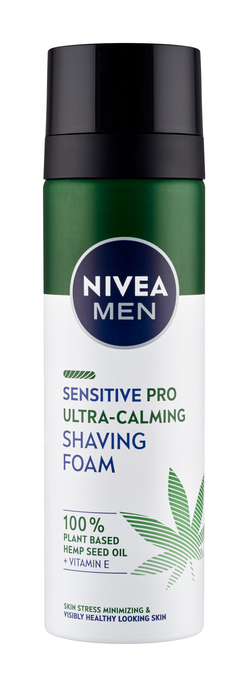 Nivea® Men Pěna na holení Sensitive Pro Ultra-Calming se 100% organickým olejem z konopných semínek a vitamínem E chrání pleť před podrážděním.