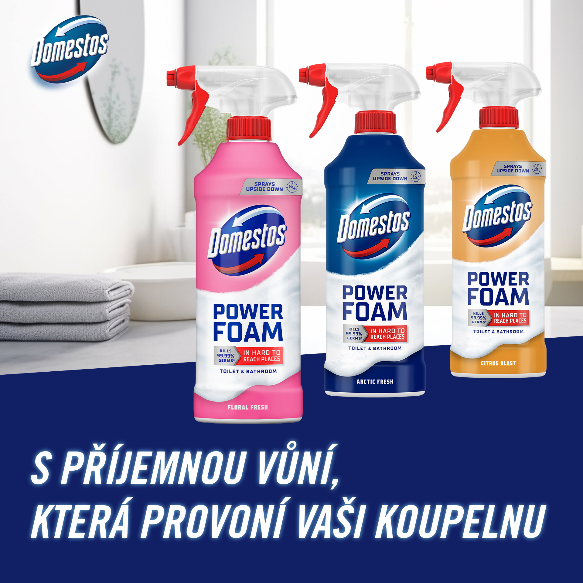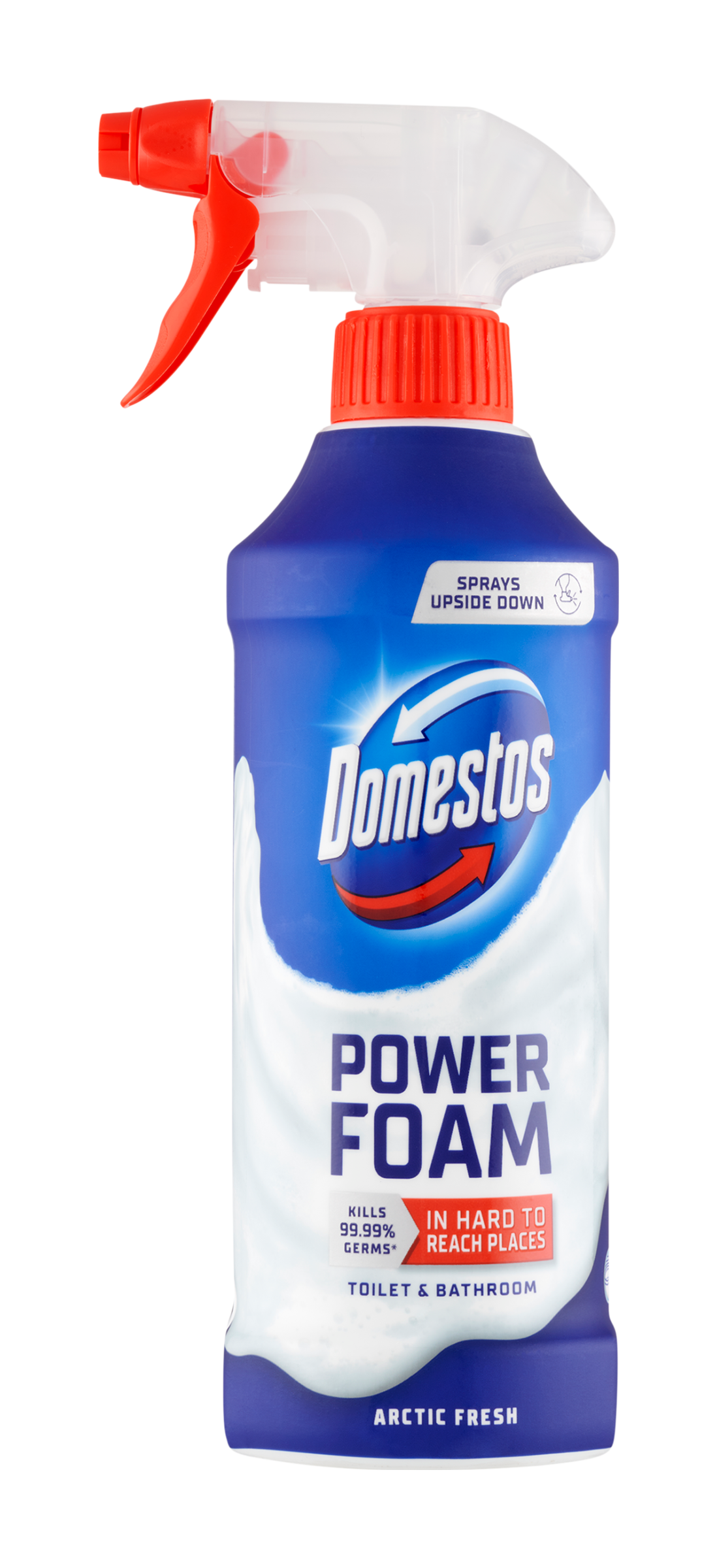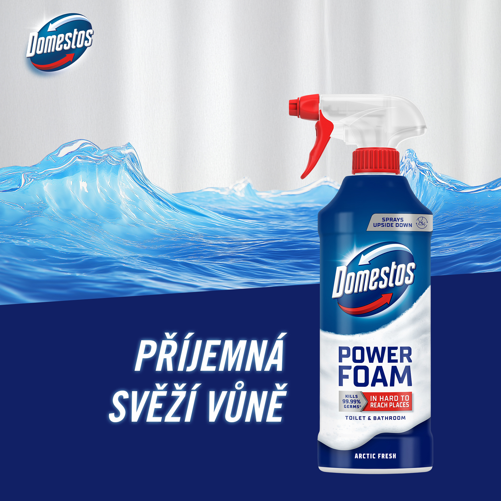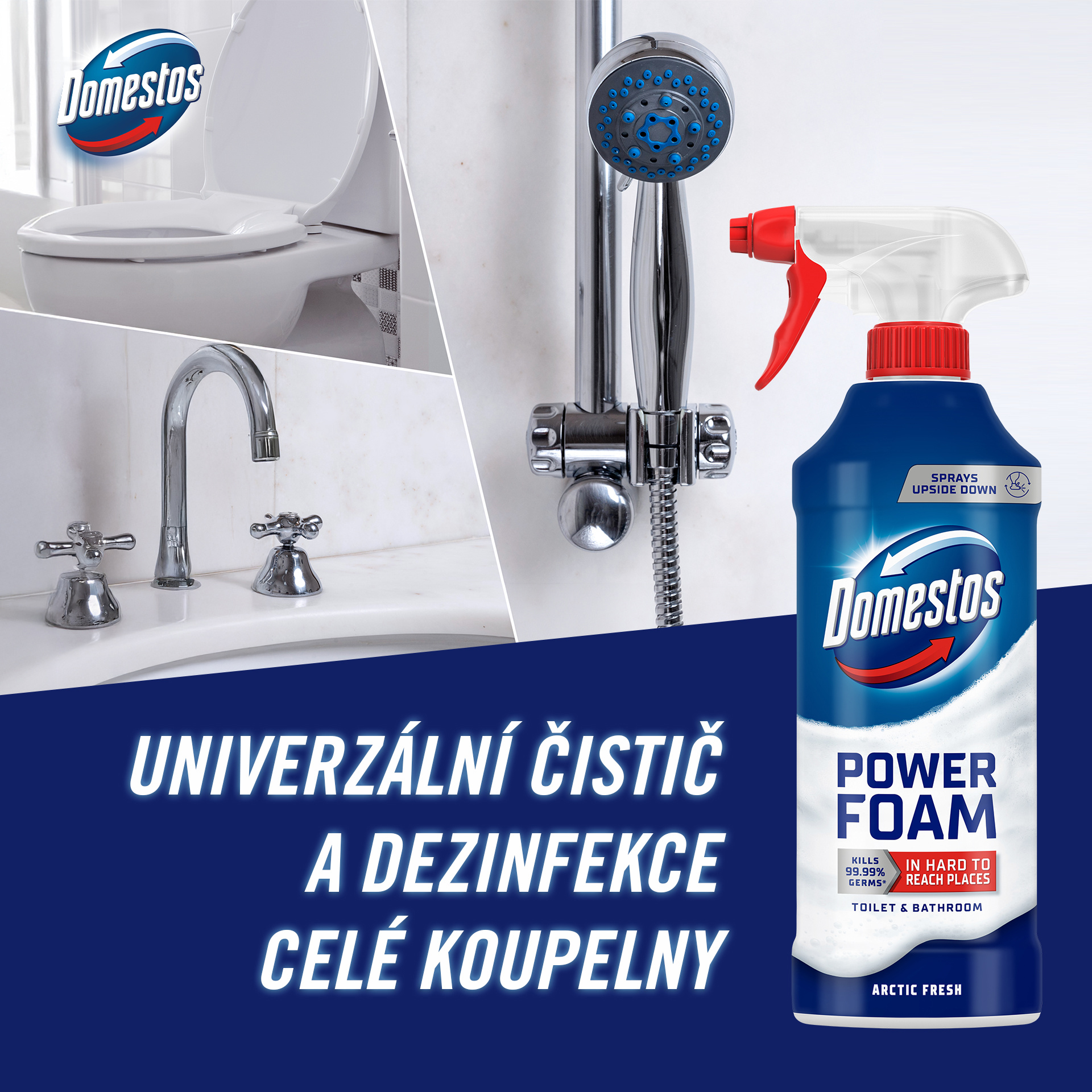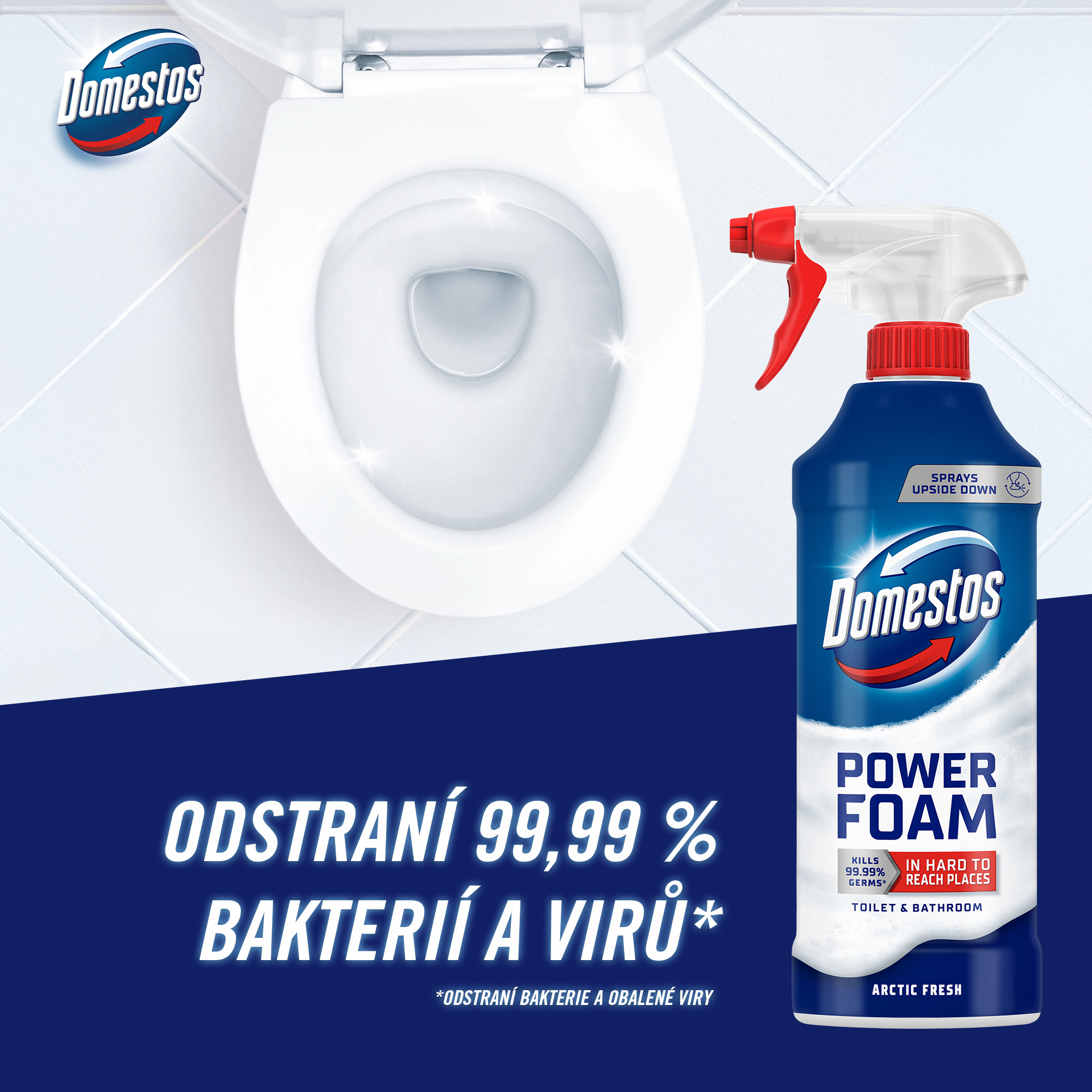 Čisticí dezinfekční pěna Domestos Power Foam Arctic Fresh mění způsob, jakým přistupujete k úklidu koupelny i toalety. Tento revoluční čistič ve formě husté aktivní pěny s inovativním rozprašovačem dosáhne i na těžko dostupná místa — jednoduše jej otočíte vzhůru nohama a aplikujete přesně tam, kde je potřeba. Domestos Power Foam účinně odstraňuje 99,9 % bakterií a obalených virů*, zatočí s vodním kamenem, mýdlovými skvrnami i dalšími nečistotami. Navíc neobsahuje chlór, je biologicky odbouratelný a provoní prostor svěží vůní Arctic Fresh. Ideální pomocník pro hygienicky čistou a svěží koupelnu.