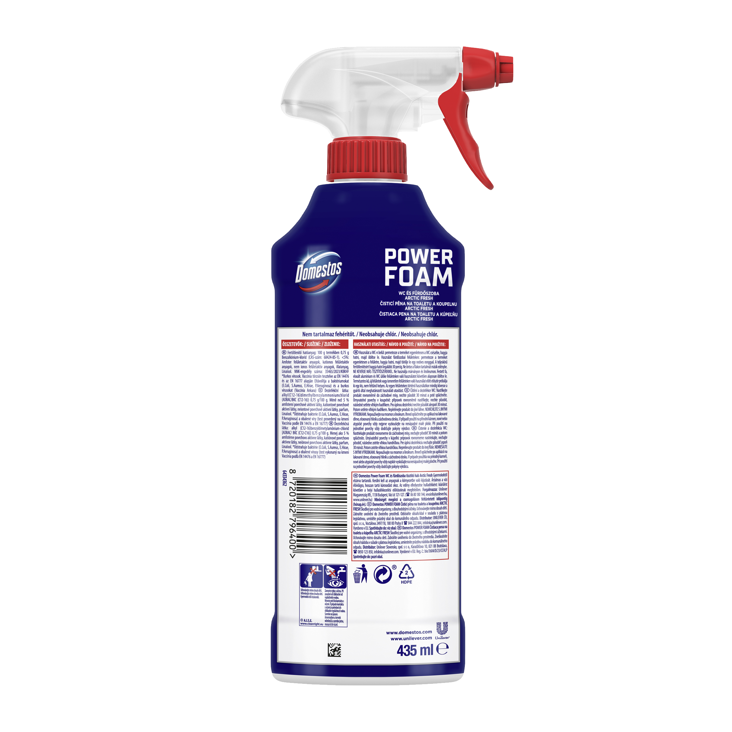 Domestos POWER FOAM Čistící pěna na toaletu a koupelnu ARCTIC FRESH. Škodlivý pro vodní organismy, s dlouhodobými účinky. Uchovávejte mimo dosah dětí. Zabraňte uvolnění do životního prostředí. Zamezte styku s očima. Při zasažení očí důkladně oči vypláchněte vodou.