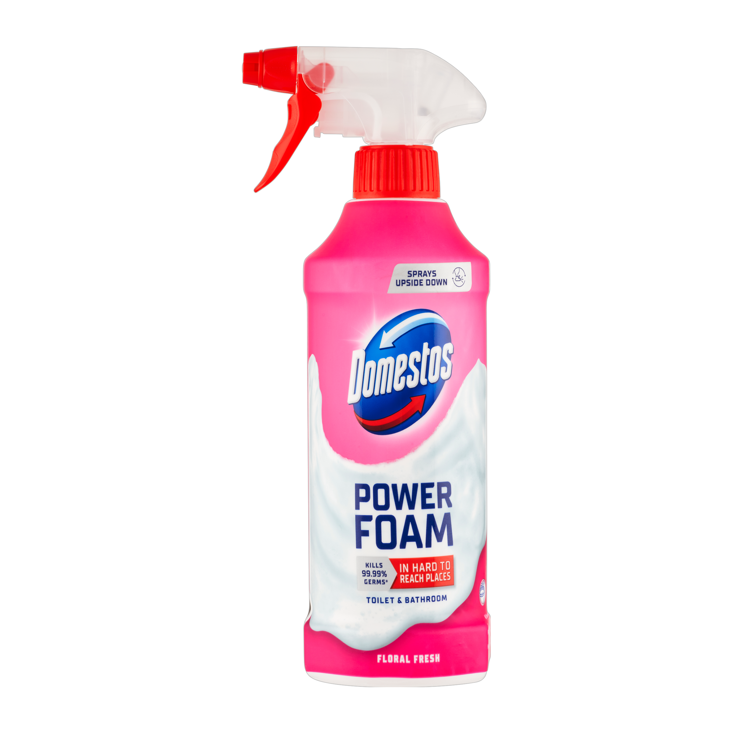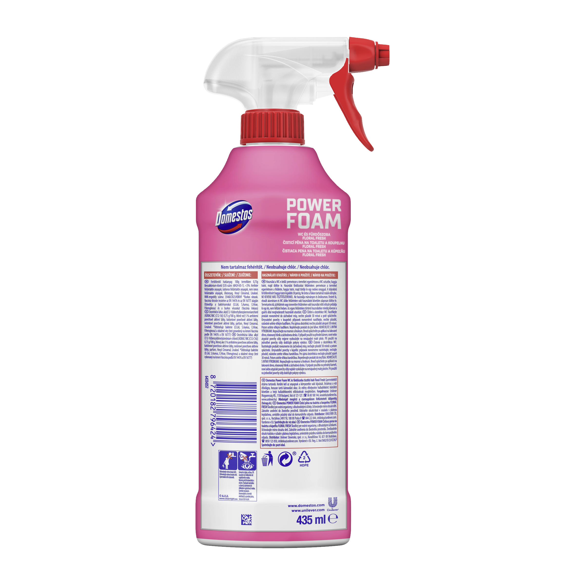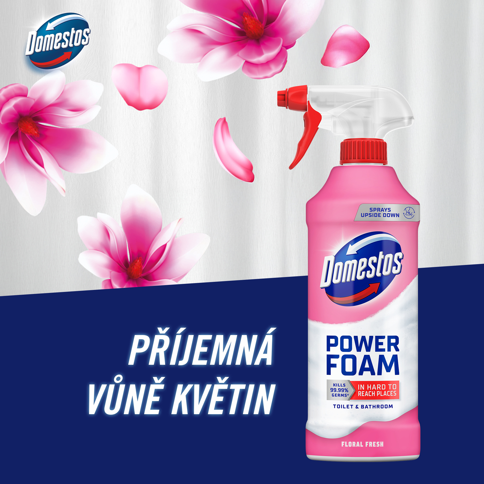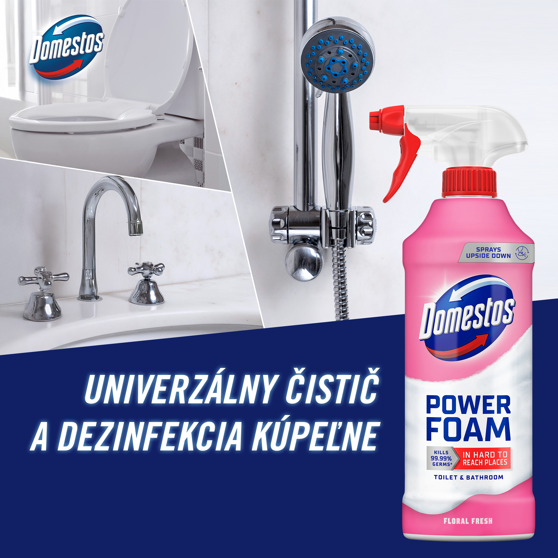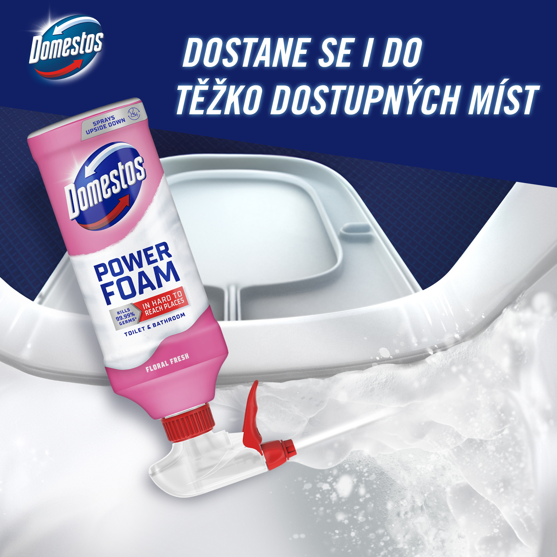 Čisticí dezinfekční pěna Domestos Power Foam Floral Fresh mění způsob, jakým přistupujete k úklidu koupelny i toalety. Tento revoluční čistič ve formě husté aktivní pěny s inovativním rozprašovačem dosáhne i na těžko dostupná místa — jednoduše jej otočíte vzhůru nohama a aplikujete přesně tam, kde je potřeba. Domestos Power Foam účinně odstraňuje 99,9 % bakterií a obalených virů*, zatočí s vodním kamenem, mýdlovými skvrnami i dalšími nečistotami. Navíc neobsahuje chlór, je biologicky odbouratelný a provoní prostor svěží květinovou vůní Floral Fresh. Ideální pomocník pro hygienicky čistou a svěží koupelnu.