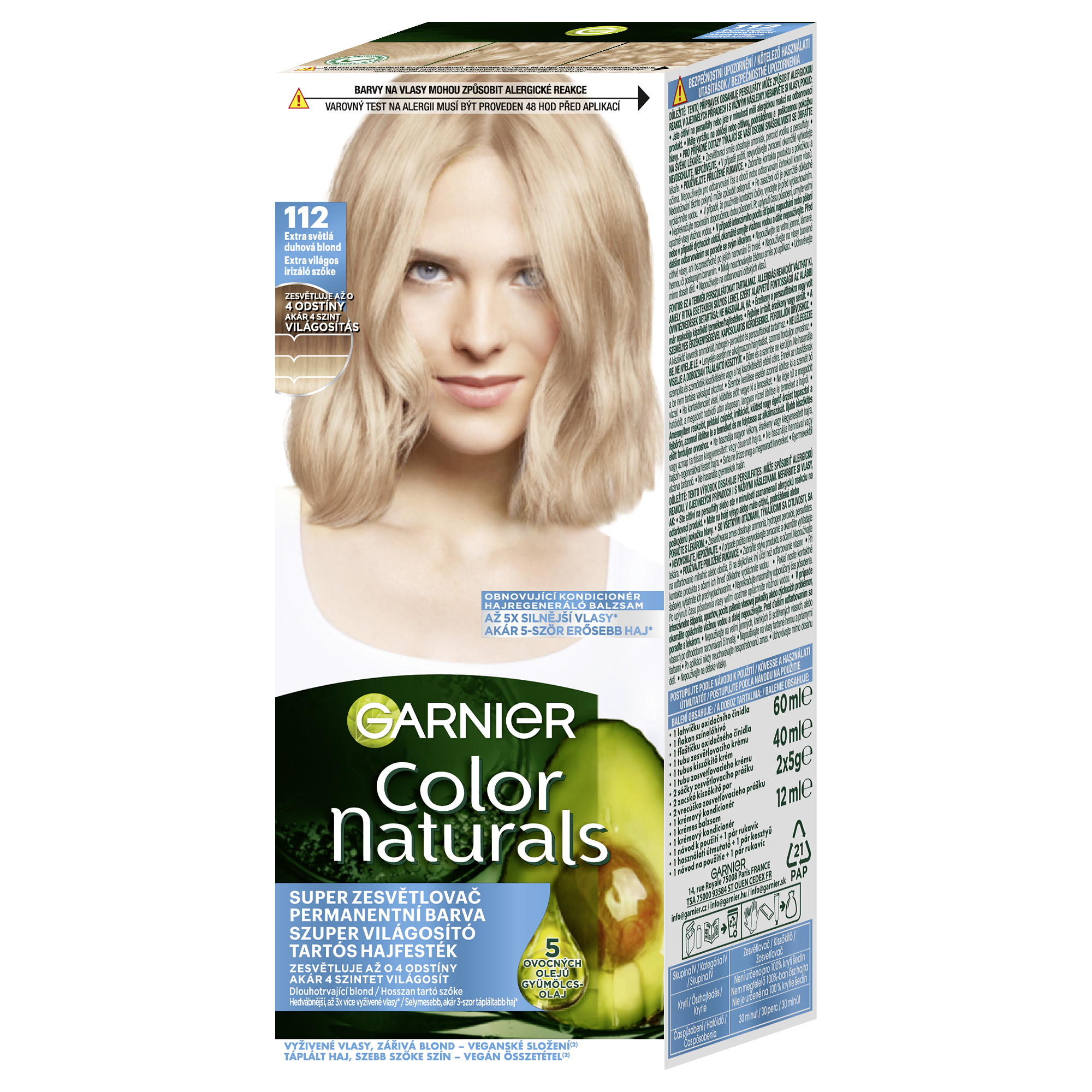 Barva na vlasy Garnier Color Naturals je vyživující permanentní barvou od Garnier. Díky složení vyživující péče obohacené o 5 olejů – olivy, avokádo, karité, kokos a argan budou vaše vlase lesklejší a hebčí. Péče intenzivně vyživuje vlasy, uhlazuje povrch vlasového vlákna a vytváří ochrannou vrstvu. Technologie „Color boost“ pro sytější a déle trvající barvu proniká do vlasových vláken a vyplňuje je sytou bohatou barvou. Díky závěrečné péči s 5 oleji je barva bohatá a dlouhotrvající. Výsledkem jsou 5x silnější vlasy, 100% krytí šedin a ochrana vlasů před vysušováním až na 8 týdnů, (*Instrumentální test). Zesvětlující barvy dokáží přirozeně odbarvit vlasy až o 4 odstíny. Studené pigmenty obsažené ve vybraných studených odstínech eliminují nežádoucí oranžové a žluté odlesky.