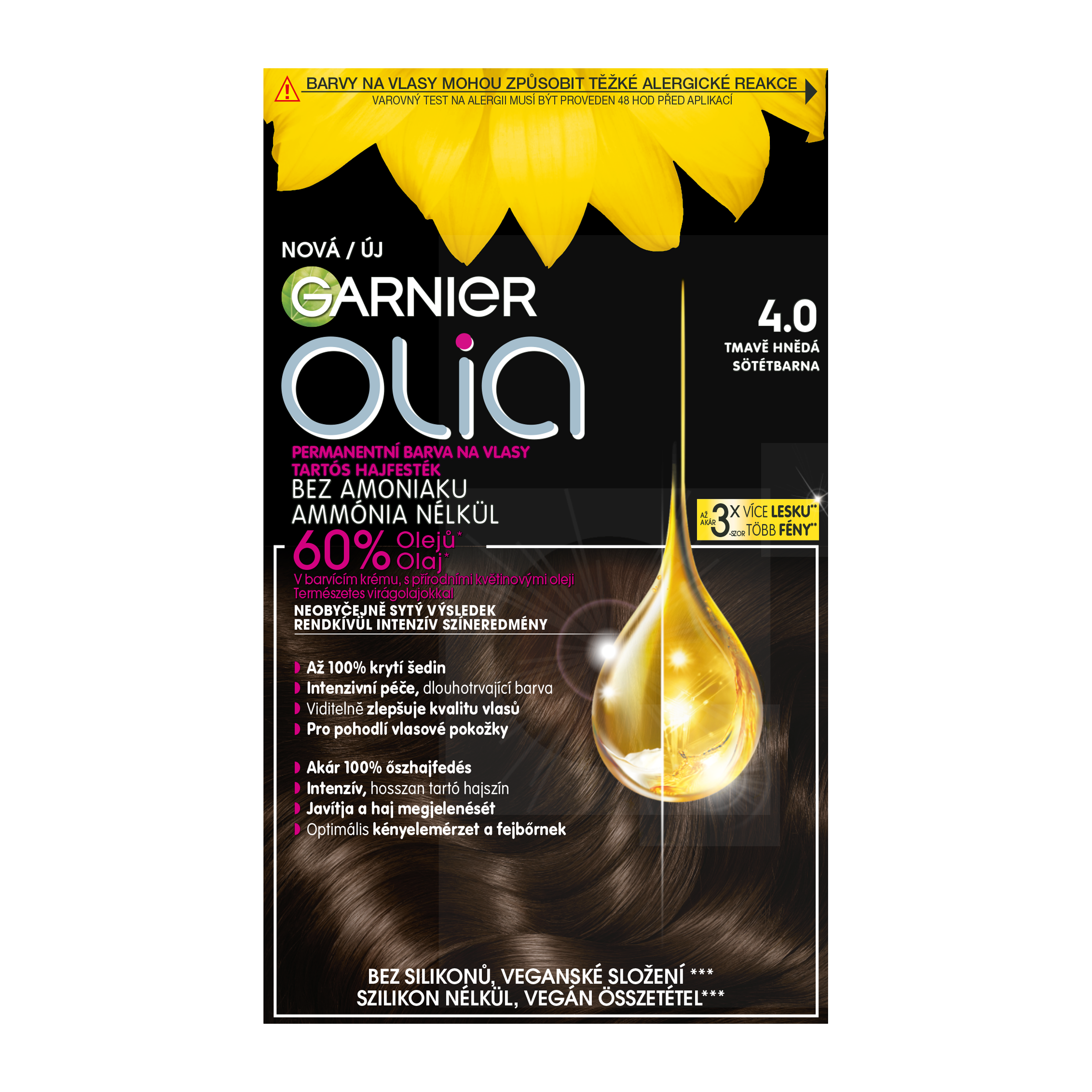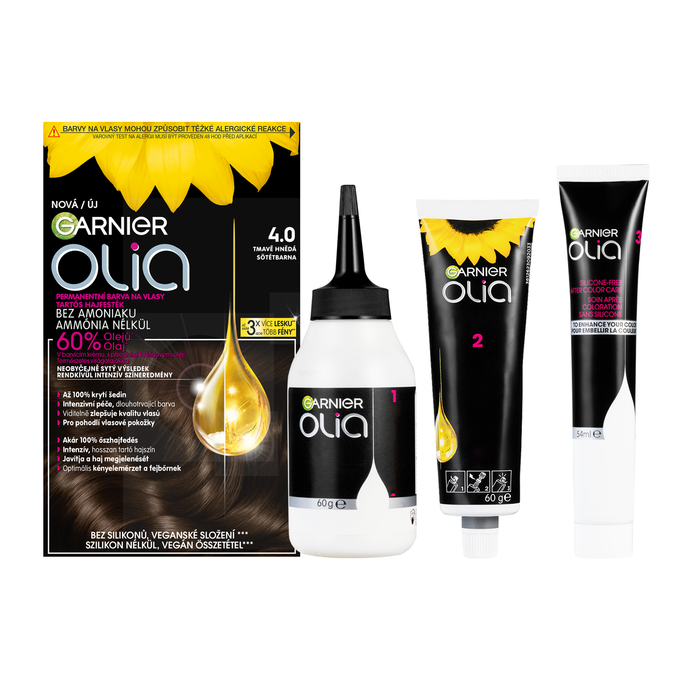 Olia od Garnier je dlouhotrvající permanentní barva na vlasy, která obsahuje 60 % olejů, neobsahuje amoniak ani silikony. Technologie olejové báze vnáší barvu hluboko do srdce vlasového vlákna a zajišťuje úžasně intenzivní výsledek. Součástí balení je nově také aplikátor, který usnadňuje aplikaci. Olia kryje až 100 % šedin. Její intenzivní péče viditelně zlepšuje kvalitu vlasů a přináší komfort pokožce hlavy.