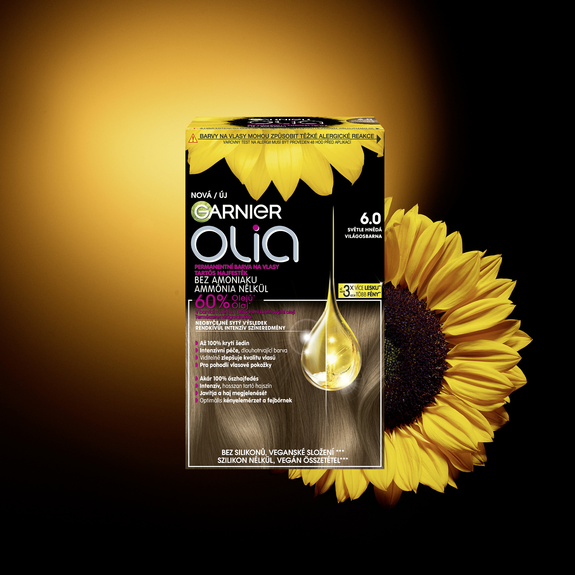 Olia od Garnier je dlouhotrvající permanentní barva na vlasy, která obsahuje 60 % olejů, neobsahuje amoniak ani silikony. Technologie olejové báze vnáší barvu hluboko do srdce vlasového vlákna a zajišťuje neobyčejně sytý výsledek. Součástí balení je nově také aplikátor, který usnadňuje aplikaci. Olia kryje až 100 % šedin. Její intenzivní péče viditelně zlepšuje kvalitu vlasů a přináší komfort pokožce hlavy.