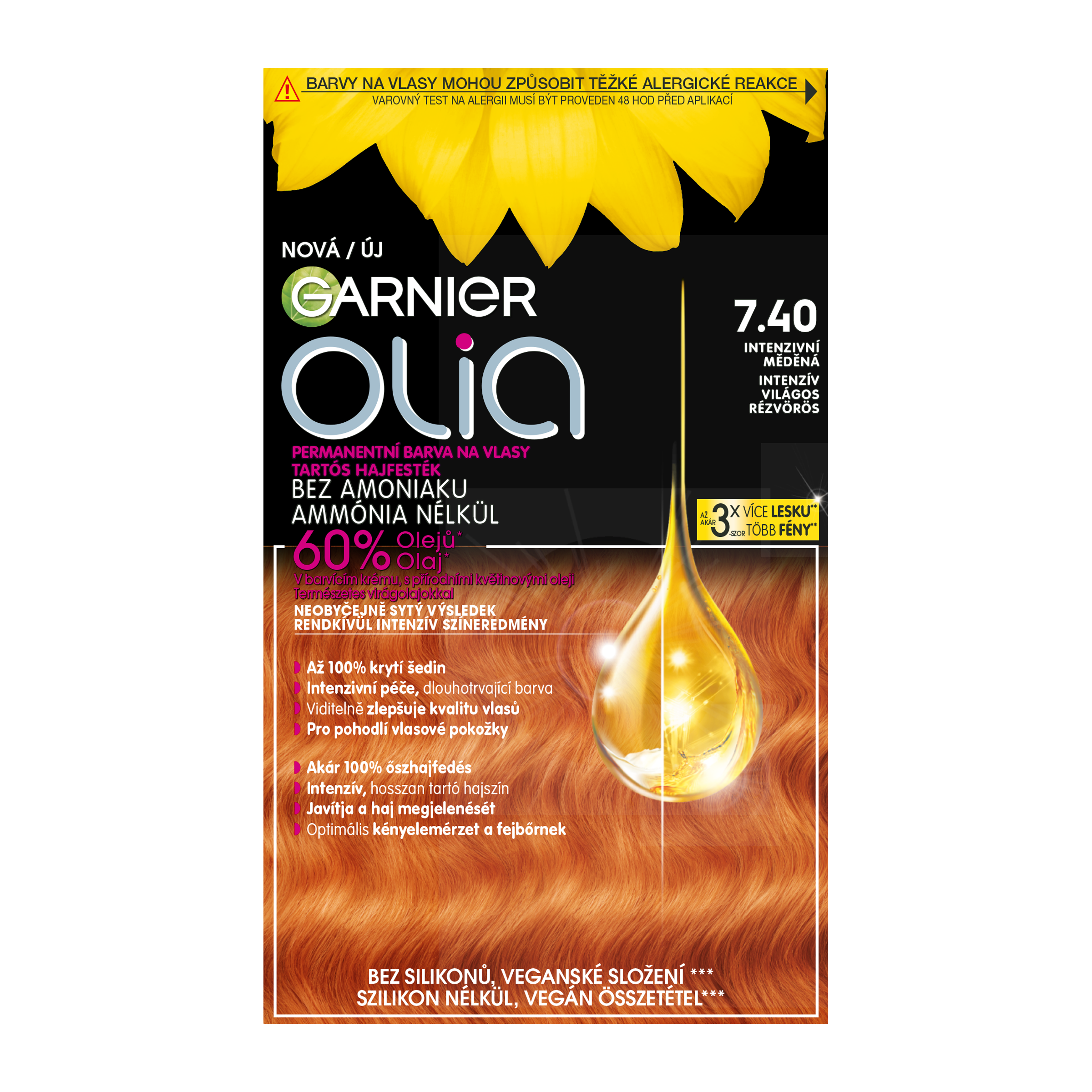 Olia od Garnier je dlouhotrvající permanentní barva na vlasy, která obsahuje 60 % olejů, neobsahuje amoniak ani silikony. Technologie olejové báze vnáší barvu hluboko do srdce vlasového vlákna a zajišťuje úžasně intenzivní výsledek. Součástí balení je nově také aplikátor, který usnadňuje aplikaci. Olia kryje až 100 % šedin. Její intenzivní péče viditelně zlepšuje kvalitu vlasů a přináší komfort pokožce hlavy.