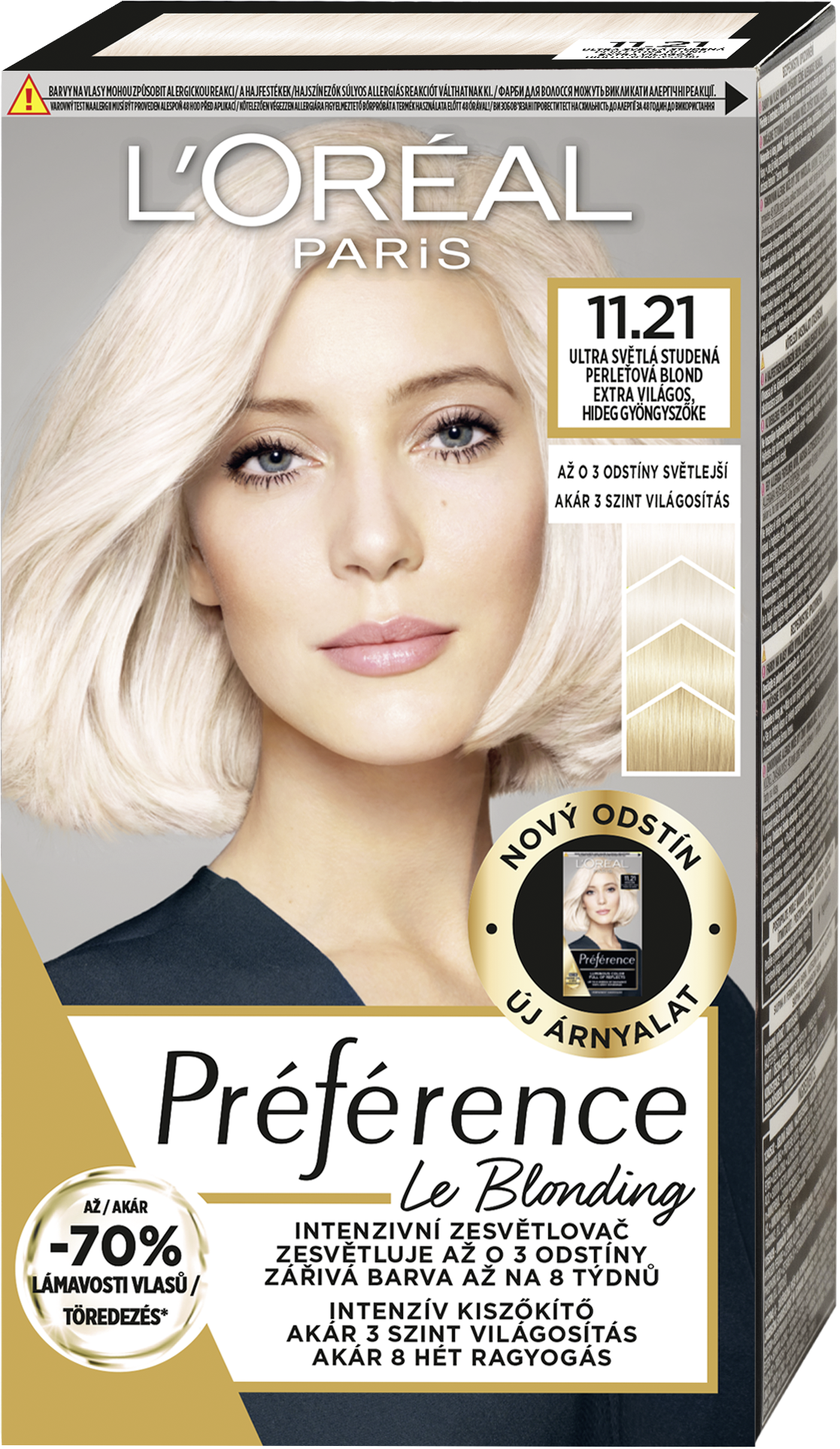 Zesvětlovač Préférence zesvětlí vaše vlasy až o 3 odstíny díky unikátní zesvětlující síle zesvětlovače Préférence Intensive. Závěrečná posilující péče vyživuje vlasová vlákna a snižuje lámavost až o 70 %.* *Instrumentální test
