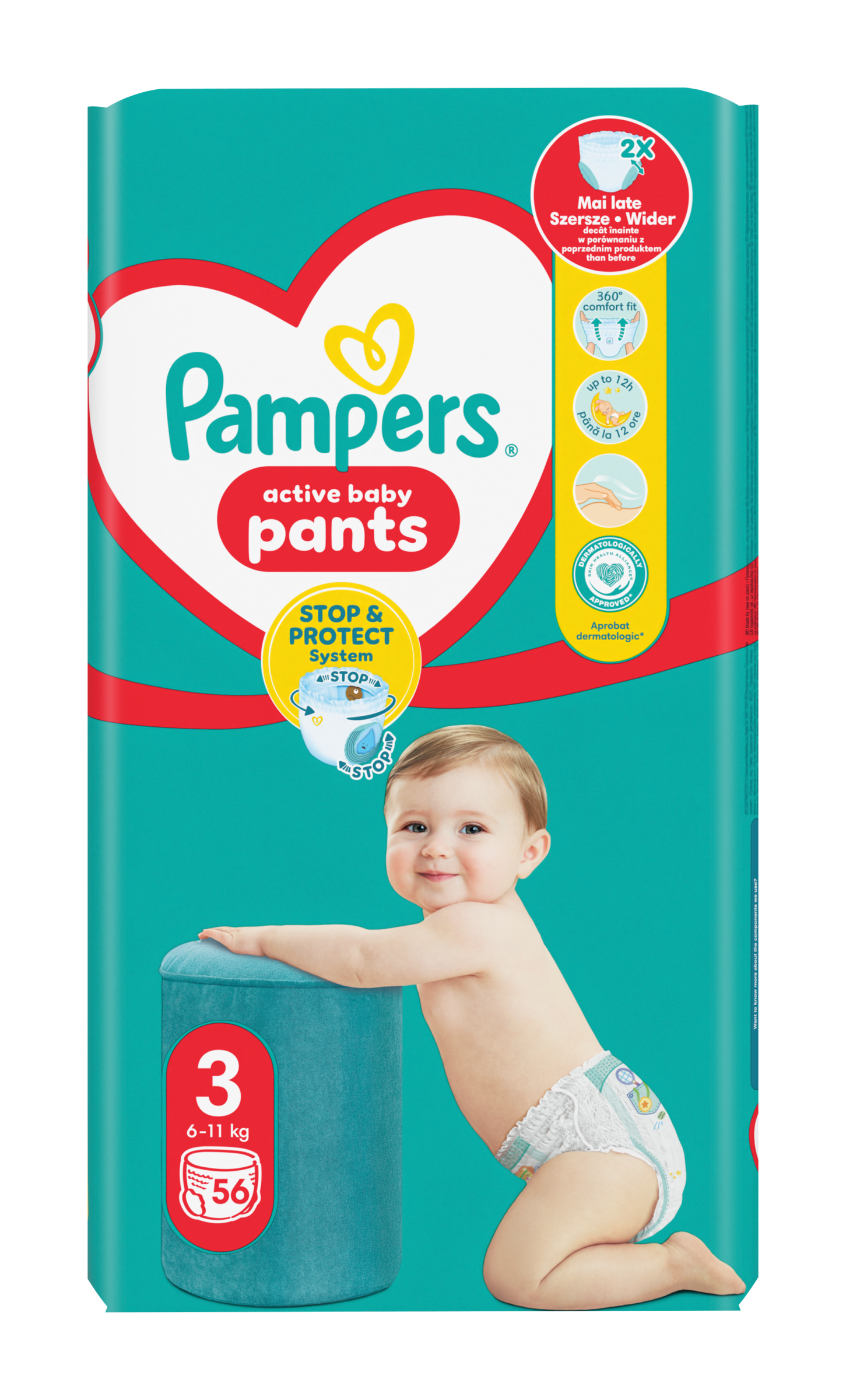 Když vaše děťátko začne být aktivnější, chcete plenku, která udrží krok s jeho novými pohyby. Plenkové kalhotky Pampers Active Baby Pants s revolučním systémem Stop & Protect nabízejí vynikající úplnou ochranu před protečením po celý den i noc a bez ohledu na polohu vašeho děťátka. Plenkové kalhotky Pampers Active Baby Pants se systémem Stop & Protect mají 2× širší* manžetky na nožičkách, které pomáhají předcházet protečení kolem nožiček, kapsu, která pomáhá zabránit protečení vzadu, 360° pružný pas, který se přizpůsobí tvaru těla vašeho děťátka při jakémkoli pohybu, a super absorpční jádro, které nabízí až 12hodinovou ochranu. Plenkové kalhotky Pampers Active Baby Pants se stejně jako všechny plenkové kalhotky od Pampers snadno vyměňují, i když je vaše děťátko neposedné: oblékají se jedním tahem a svlékají se roztrhnutím na bocích. Potom je stačí srolovat a zajistit páskem pro snadnou likvidaci. Stejně jako pro vás je i pro Pampers bezpečnost vašeho děťátka prioritou: Plenkové kalhotky Pampers Active Baby Pants jsou dermatologicky testované a schválené dermatology z organizace Skin Health Alliance. Chcete se o složení výrobků Pampers dozvědět víc? Navštivte pampers.cz. *v porovnání s předchozí plenkou
