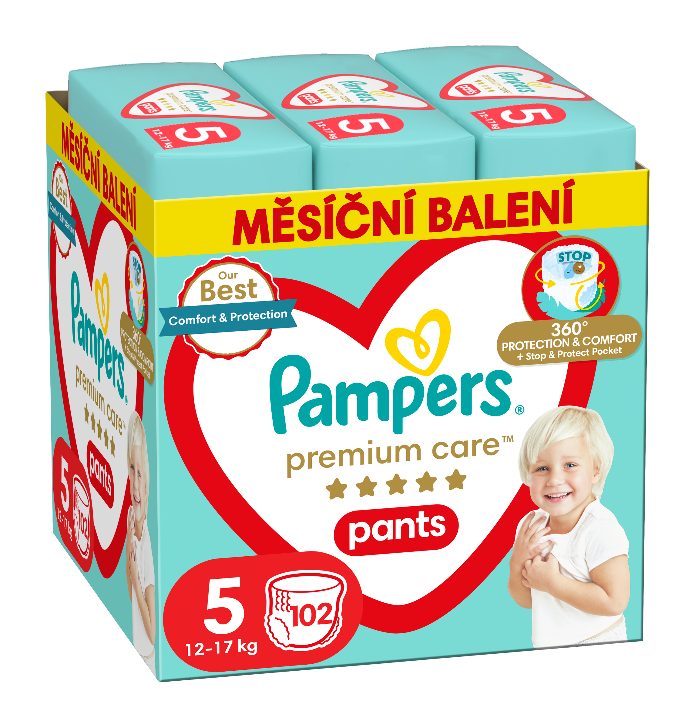 Plenkové kalhotky Premium Care 12 - 17 kg, vel. 5 - měsíční balení 102 ks