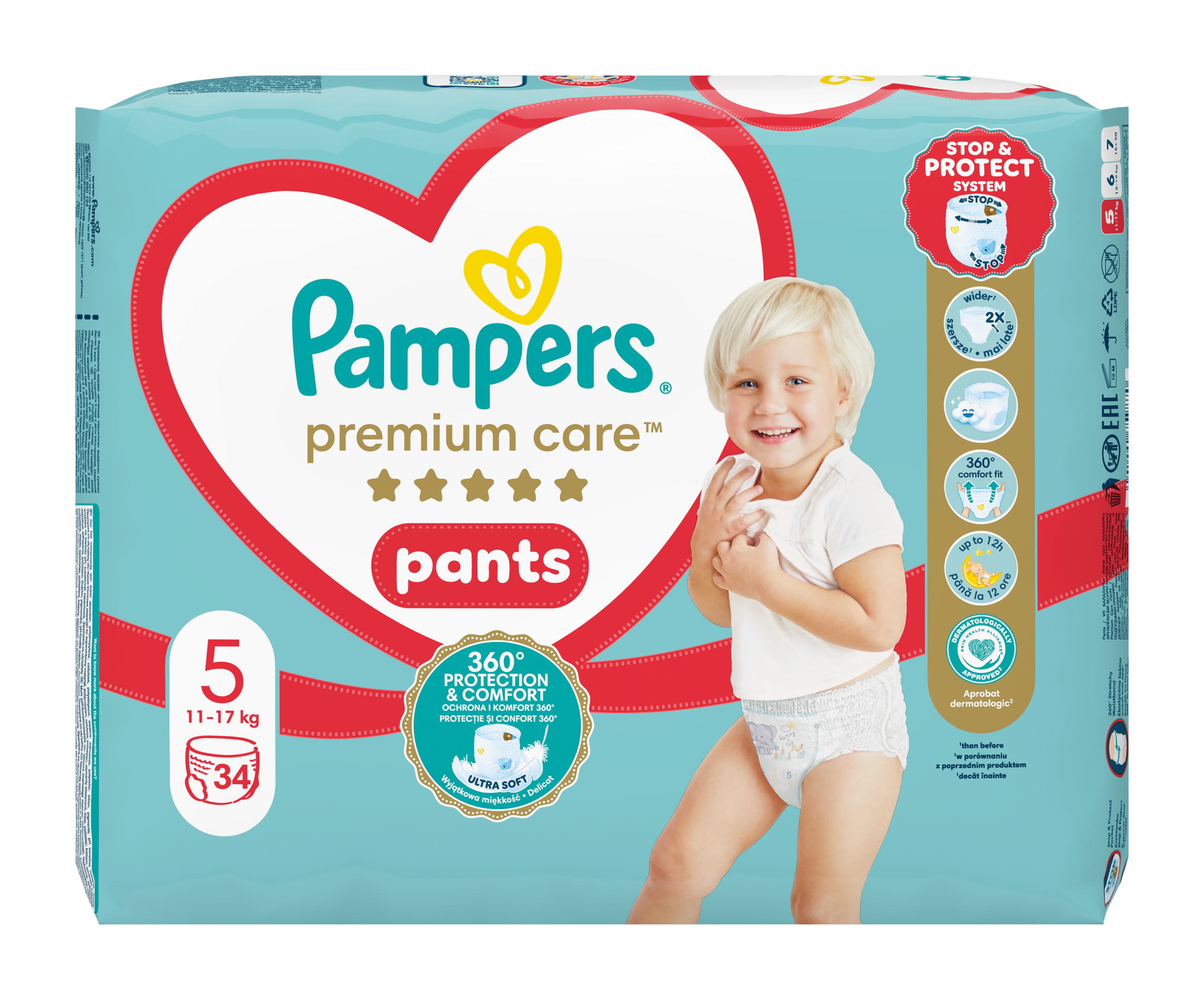 Jakmile začne být vaše děťátko aktivnější, budete potřebovat takovou plenku, která mu pohodlně padne a dokáže je spolehlivě chránit při každém pohybu. Dopřejte svému děťátku nejlepší pohodlí a ochranu před protečením od Pampers s plenkovými kalhotkami Pampers Premium Care Pants: jejich 2× širší* hebké manžetky chrání před zarudnutím a protečení, jejich ultra hebký pružný pas 360° FIT se přizpůsobuje pohybům vašeho děťátka při objevování světa a jejich jedinečná kapsa Stop & Protect pomáhá zabránit protečení vzadu. Plenkové kalhotky Pampers Premium Care se stejně jako všechny plenkové kalhotky od Pampers snadno přebalují, i když je vaše děťátko neposedné: oblékají se jedním tahem a svlékají se roztrhnutím na bocích. Potom je stačí srolovat a zajistit páskem pro snadnou likvidaci. Stejně jako pro vás je i pro Pampers bezpečnost vašeho děťátka prioritou: Plenkové kalhotky Pampers Premium Care Pants jsou dermatologicky testované a schválené dermatology z organizace Skin Health Alliance. Chcete se o složení výrobků Pampers dozvědět víc? Navštivte pampers.cz. *v porovnání s předchozím modelem.