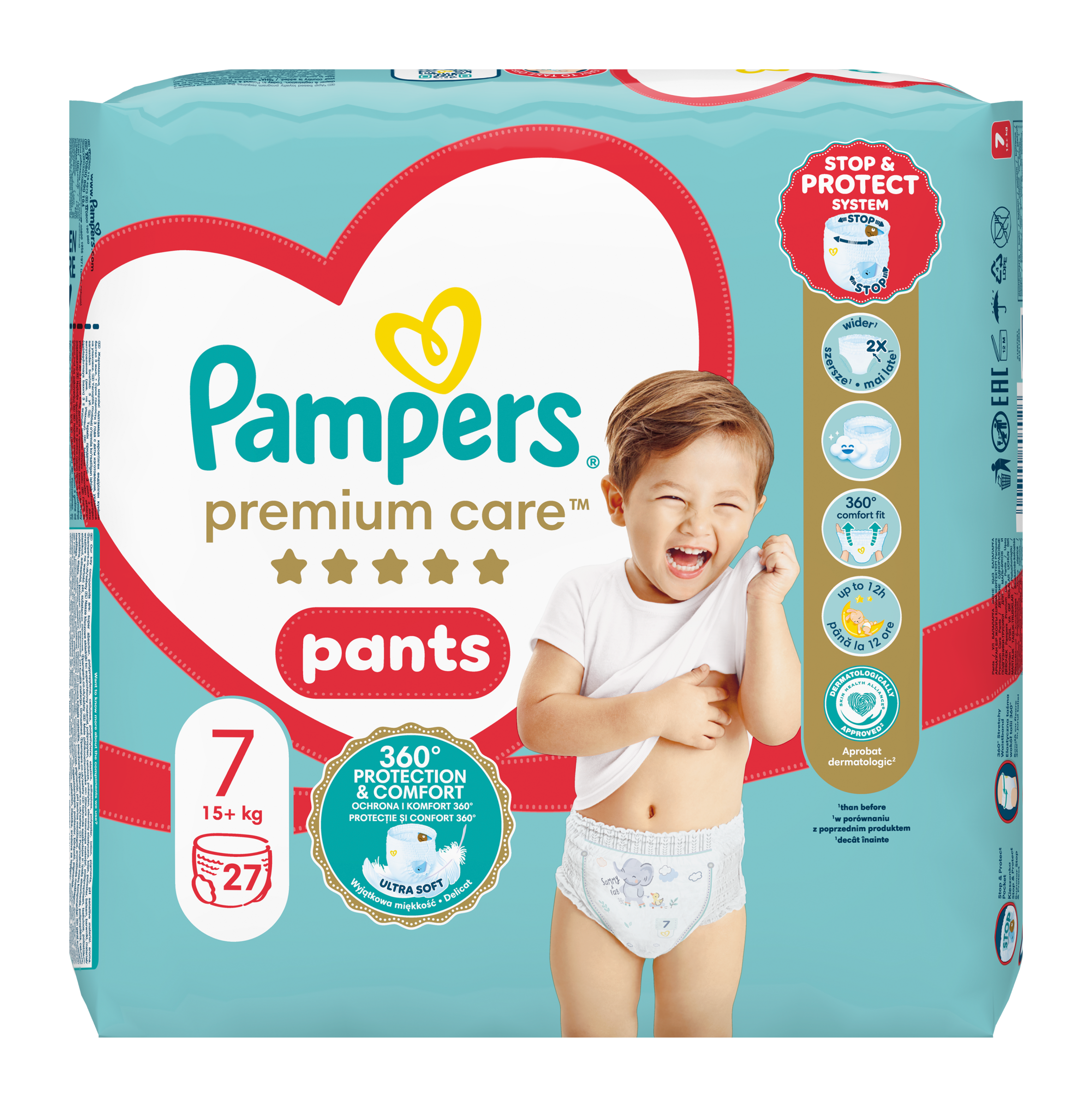 Jakmile začne být vaše děťátko aktivnější, budete potřebovat takovou plenku, která mu pohodlně padne a dokáže je spolehlivě chránit při každém pohybu. Dopřejte svému děťátku nejlepší pohodlí a ochranu před protečením od Pampers s plenkovými kalhotkami Pampers Premium Care Pants: jejich 2× širší* hebké manžetky chrání před zarudnutím a protečení, jejich ultra hebký pružný pas 360° FIT se přizpůsobuje pohybům vašeho děťátka při objevování světa a jejich jedinečná kapsa Stop & Protect pomáhá zabránit protečení vzadu. Plenkové kalhotky Pampers Premium Care 7 se stejně jako všechny plenkové kalhotky od Pampers snadno přebalují, i když je vaše děťátko neposedné: oblékají se jedním tahem a svlékají se roztrhnutím na bocích. Potom je stačí srolovat a zajistit páskem pro snadnou likvidaci. Stejně jako pro vás je i pro Pampers bezpečnost vašeho děťátka prioritou: Plenkové kalhotky Pampers Premium Care Pants jsou dermatologicky testované a schválené dermatology z organizace Skin Health Alliance. Chcete se o složení výrobků Pampers dozvědět víc? Navštivte pampers.cz. *v porovnání s předchozím modelem.