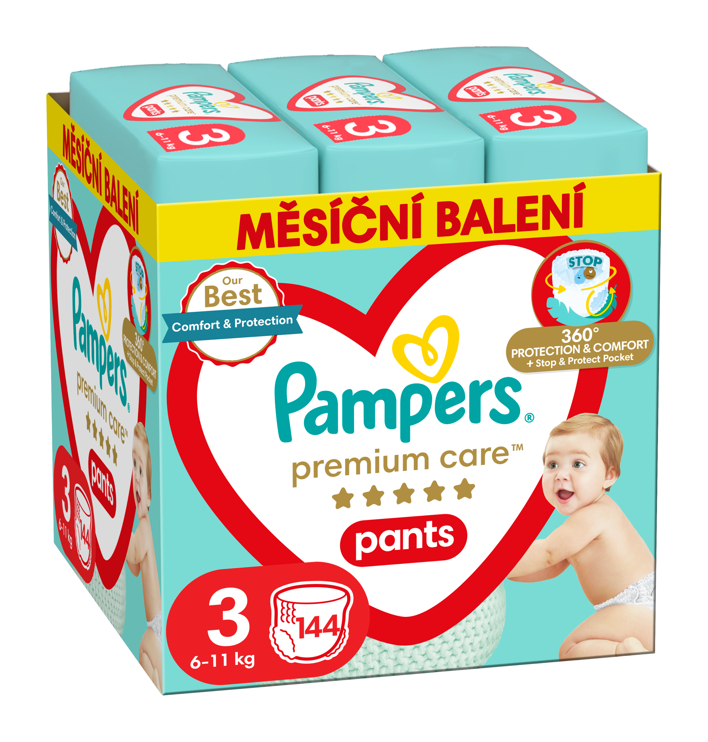 Plenkové kalhotky Premium Care, 6–11 kg, vel. 3, měsíční balení 144 ks