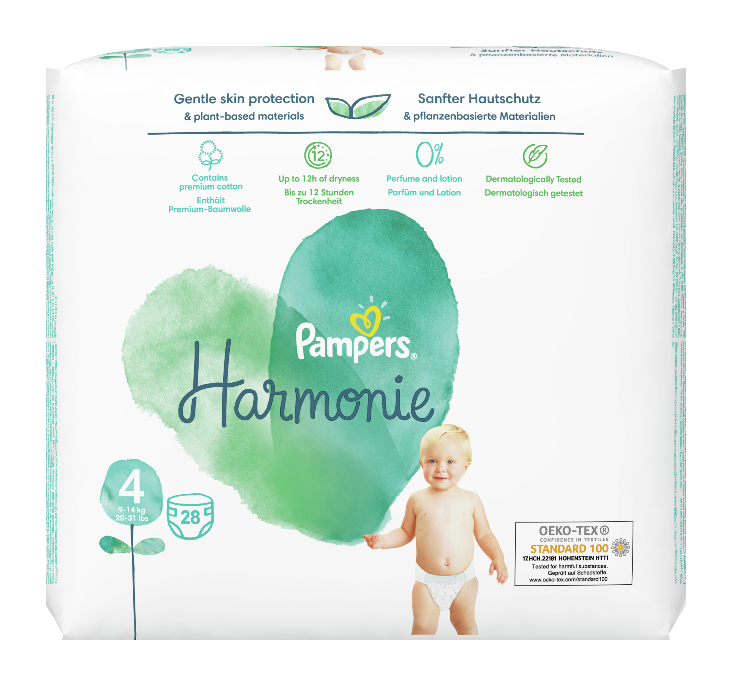 Jemná ochrana pokožky. Se složkami rostlinného původu. Plenky Pampers Harmonie jsou vyrobené z prvotřídní bavlny, hebkých rostlinných vláken a jiných pečlivě vybíraných materiálů, jsou dermatologicky testované a šetrné k pokožce vašeho děťátka. Jsou bez parfemace, neobsahují pleťové mléko ani žádné z 26 látek klasifikovaných směrnicí EU jako alergeny, a zaručují až 12 hodin sucha od Pampers, pro jistotu kvality, na kterou se rodiče mohou spolehnout. Jsou vybavené praktickým indikátorem vlhkosti od Pampers a mají roztomilý potisk: vy i vaše děťátko si je absolutně zamilujete. Plenky Pampers Harmonie se vyrábí z celulózy získávané z udržitelných zdrojů a mají jednu z nejnáročnějších certifikací na světě, Oeko-Tex Standard 100. Chcete se o složení výrobků Pampers dozvědět víc? Navštivte pampers.cz