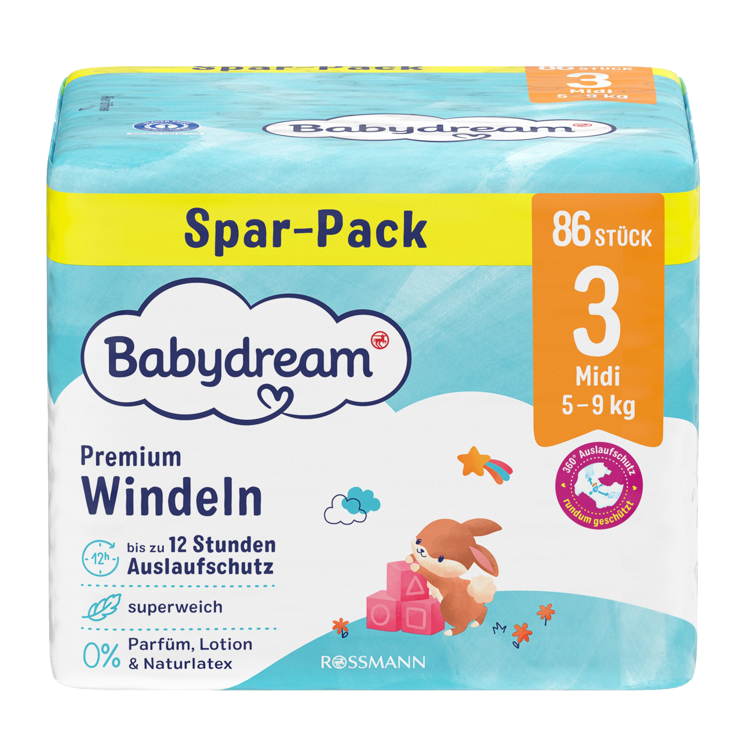 Sametově hebké jednorázové plenky Babydream Premium Midi pro děti od 5 do 9 kg poskytují optimální ochranu citlivé pokožky vašeho dítěte. Zůstávají suché až 12 hodin a mimořádně rychle absorbují tekutinu.