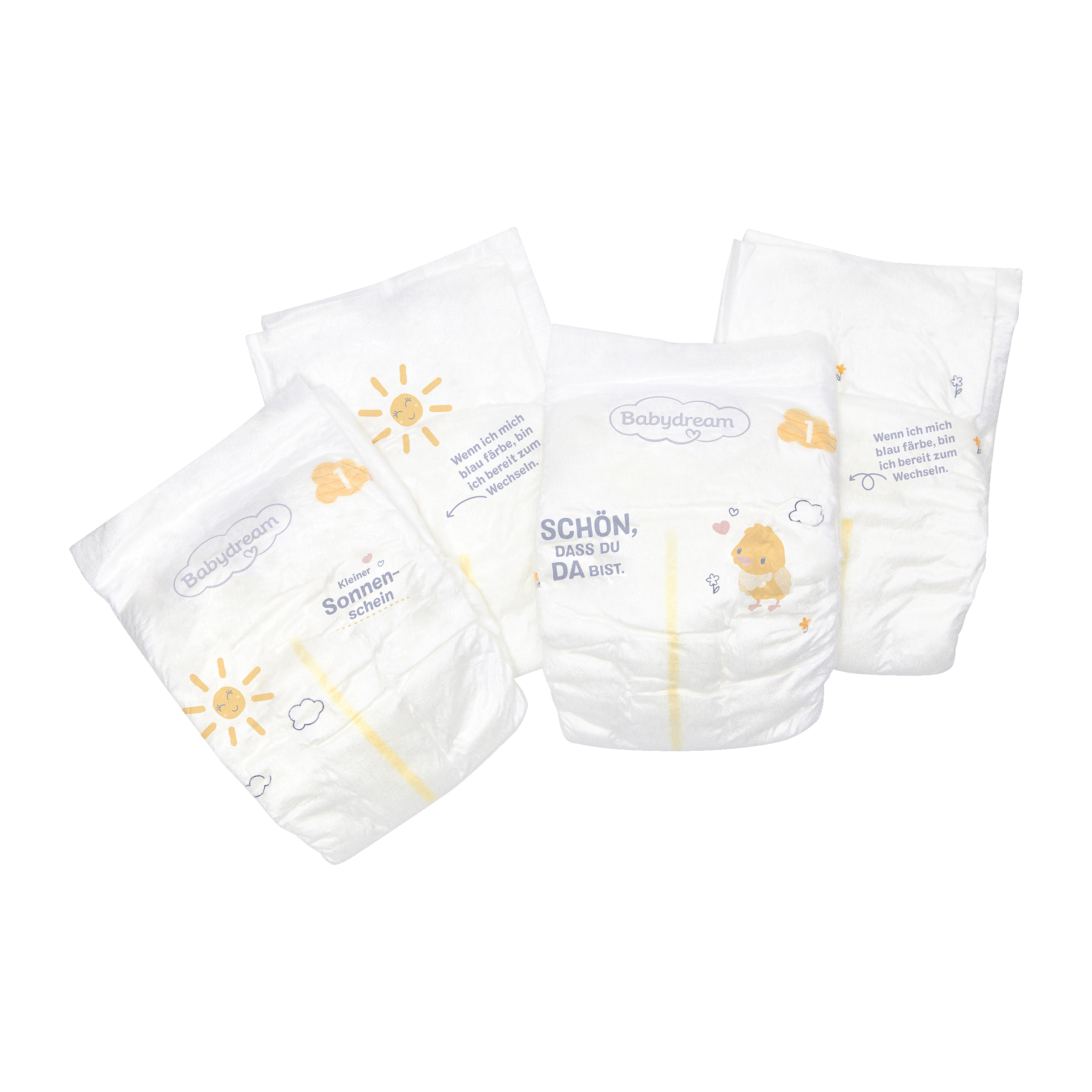 Sametově hebké jednorázové plenky Babydream Premium Newborn pro děti od 2 do 5 kg poskytují optimální ochranu citlivé pokožky vašeho dítěte. Zůstávají suché až 12 hodin a mimořádně rychle absorbují tekutinu. Praktický indikátor vlhkosti vás upozorní na potřebu výměny plenky změnou barvy – zbarví se modře, když je třeba plenku vyměnit.