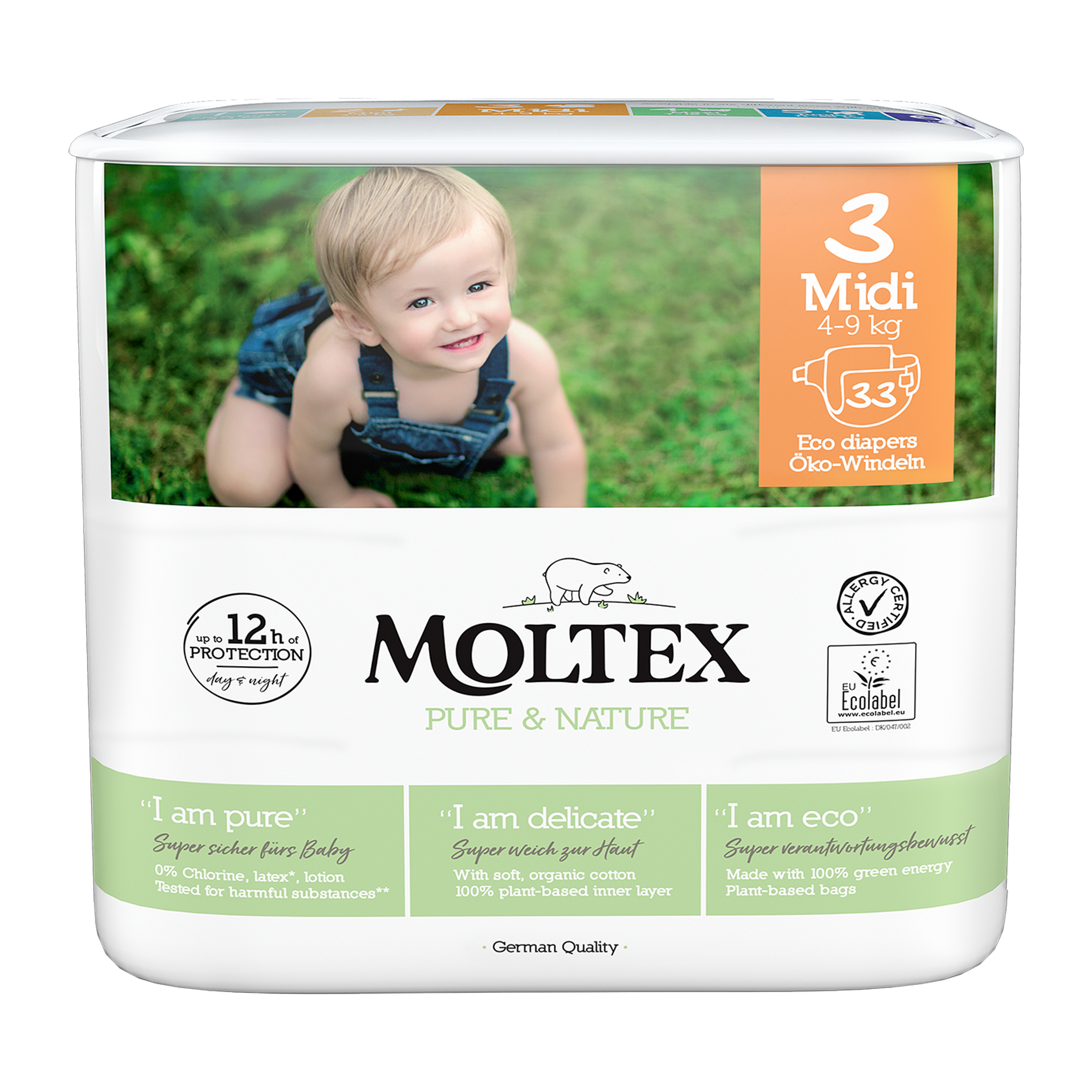 Ekologické plenky nemusejí být nudné! Potisk je samozřejmě provedený bezpečným, certifikovaným inkoustem. Plenky jsou vyráběny za použití 100% obnovitelné energie. Výrobce usiluje o snížení produkce plastů, a proto jsou obaly plenek Moltex ze 100% recyklovaných materiálů.. Výrobce plenek Moltex Pure & Nature zaručuje shodu se všemi standardy na trhu, všechny materiály použité pro výrobu jsou pravidelně testovány nezávislými laboratořemi.