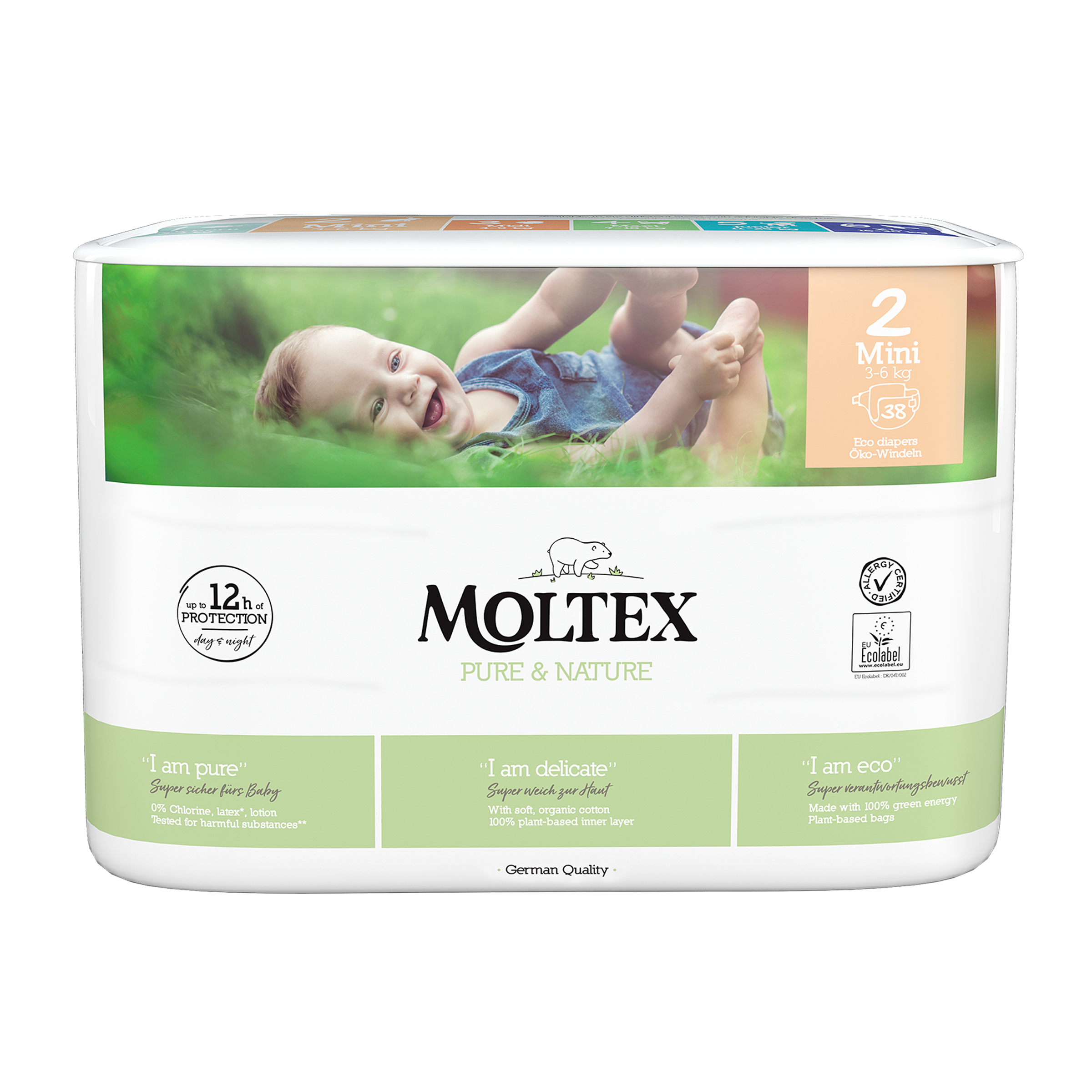 Ekologické plenky nemusejí být nudné! Potisk je samozřejmě provedený bezpečným, certifikovaným inkoustem. Plenky jsou vyráběny za použití 100% obnovitelné energie Výrobce usiluje o snížení produkce plastů, a proto jsou obaly plenek Moltex ze 100% recyklovaných materiálů. Výrobce plenek Moltex Pure & Nature zaručuje shodu se všemi standardy na trhu, všechny materiály použité pro výrobu jsou pravidelně testovány nezávislými laboratořemi.