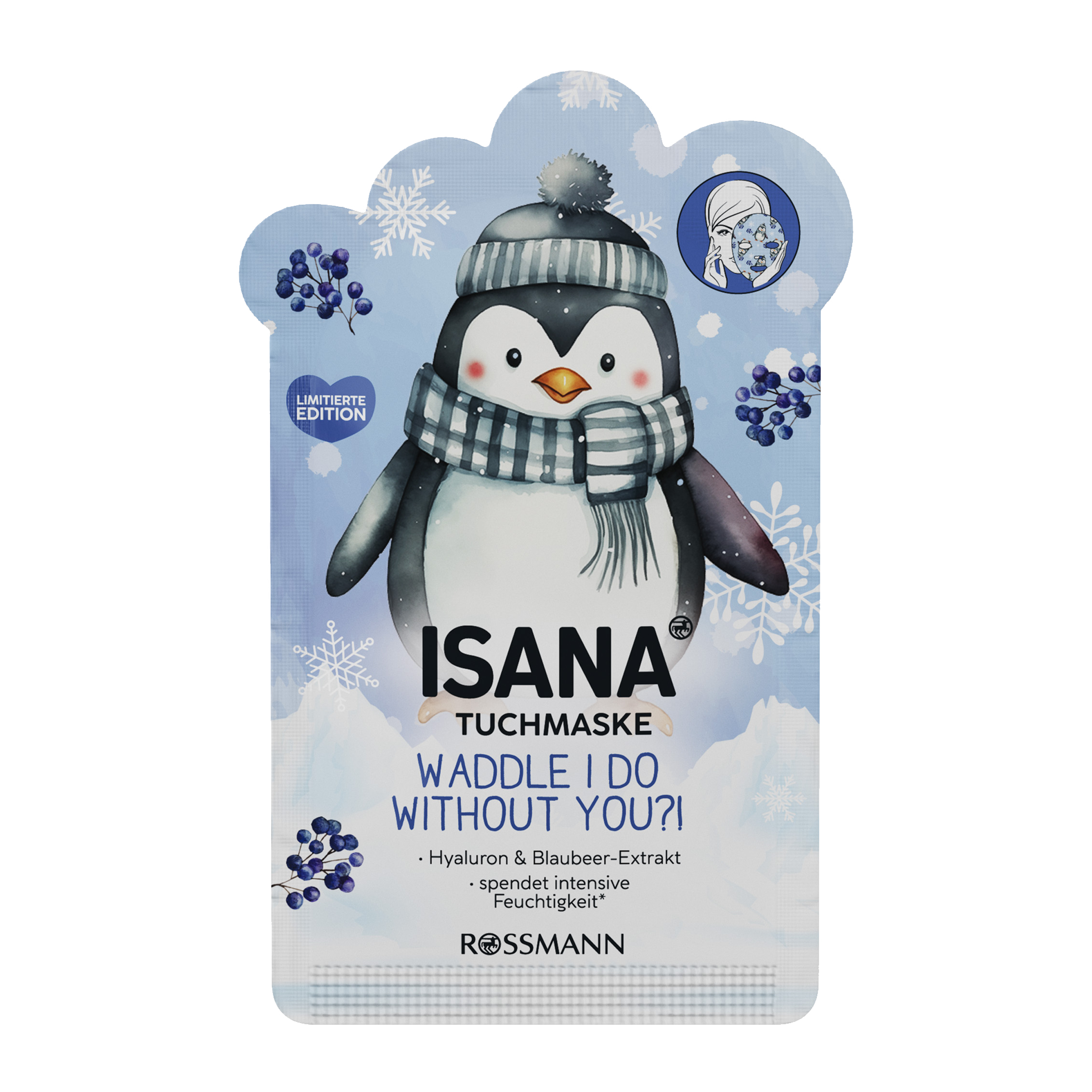 Dopřejte své pleti kapku roztomilého rozmazlování s Isana plátýnkovou maskou Waddle I Do Without You?! Tato hravá maska s výtažkem z borůvek a kyselinou hyaluronovou je jako objetí pro vaši pleť – dodává jí intenzivní hydrataci až na 24 hodin*, zanechává ji svěží, hebkou a příjemně pružnou. Okamžitý efekt vyhlazení** a příval šťavnaté péče si zamilujete už po prvním použití.