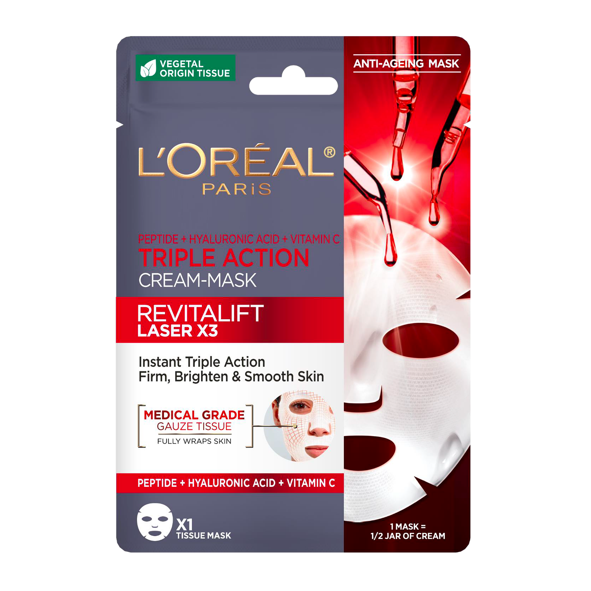 Textilní pleťová maska s okamžitým trojitým účinkem proti stárnutí pleti, pro zpevnění a rozjasnění, obohacená o peptidy, kyselinou hyaluronovou a vitamin C.