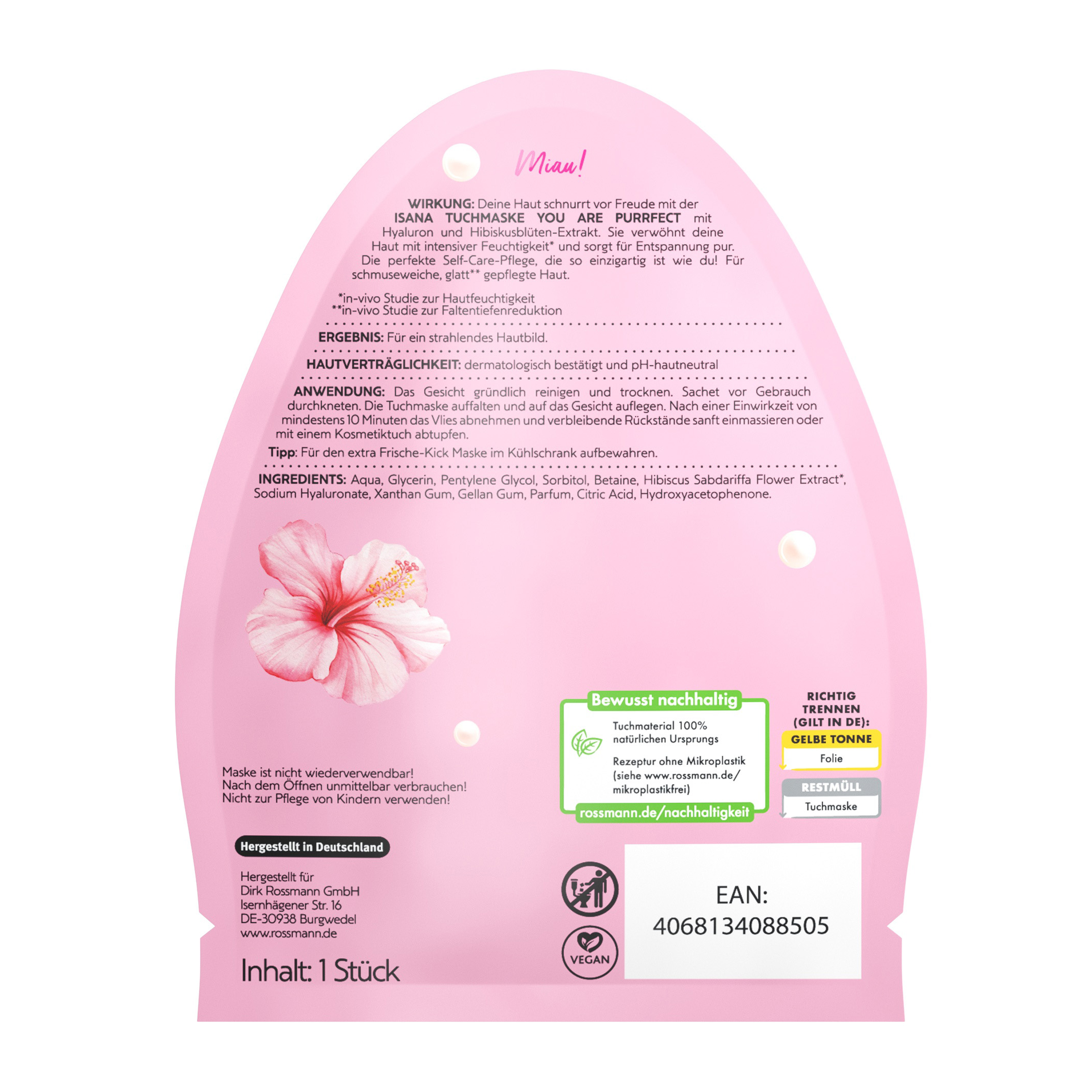 Rozmazlíte svou pleť maskou ISANA You are Purrfect s kyselinou hyaluronovou a výtažkem z květů ibišku. Intenzivní hydratace* a výtažky z květin vaší pleti dodají potřebnou výživu a navrátí jí pocit svěžesti a vitality.