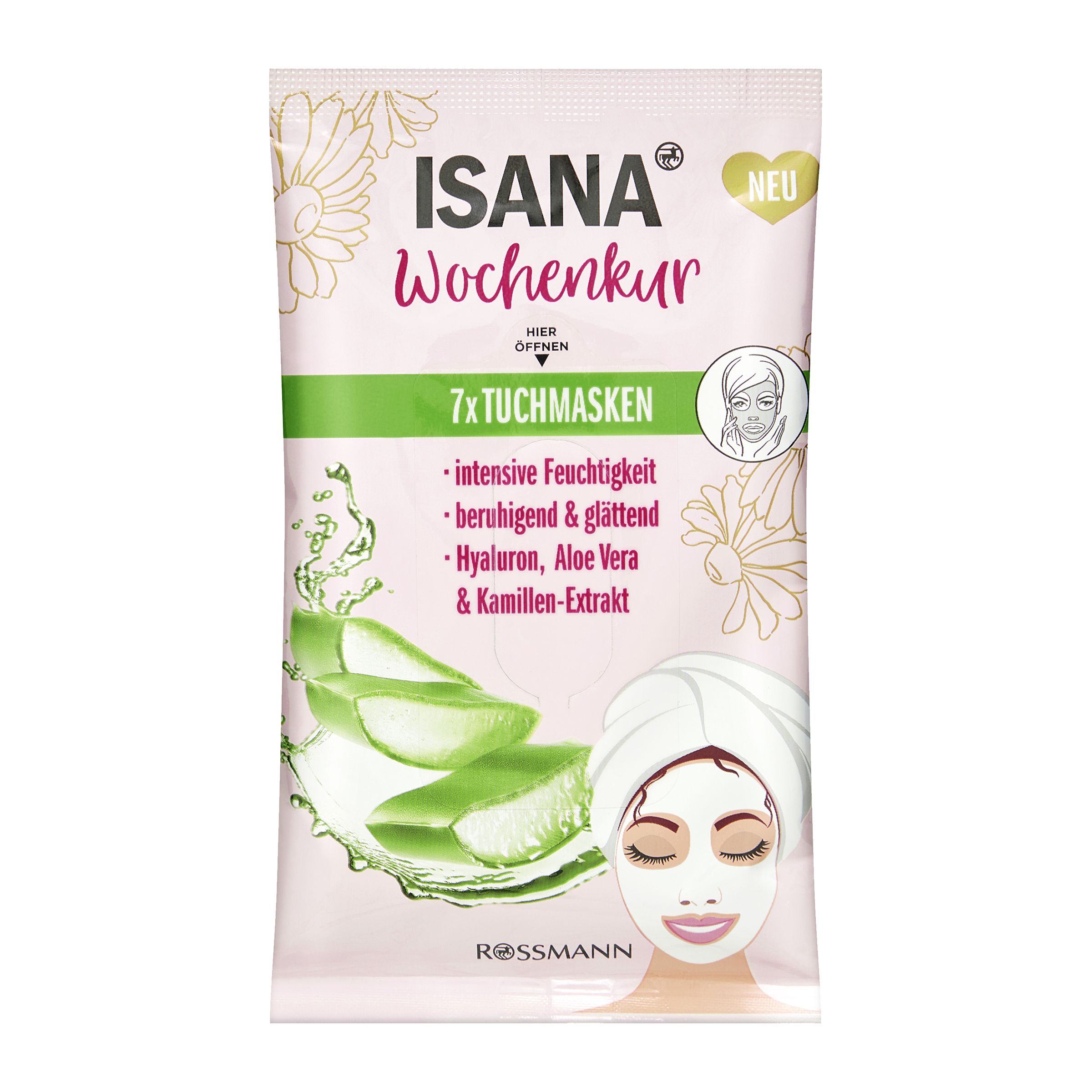 Pleťová maska ISANA s kombinací účinných látek hyaluronu, aloe vera a výtažku z heřmánku intenzivně hydratuje, zklidňuje pleť a zmírňuje pocity napětí. Linie sucha se zjemní. Pečující složení s panthenolem podporuje přirozenou regeneraci pokožky. Pleť vypadá zářivě svěží a osvěžená. Vhodné pro všechny typy pleti. Používejte jako týdenní kúru - 1x nebo několikrát týdně podle potřeby.