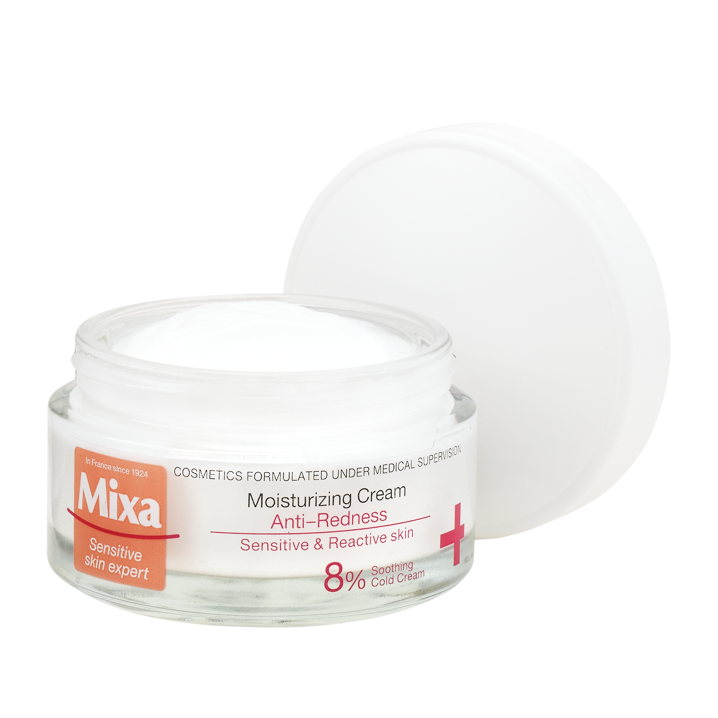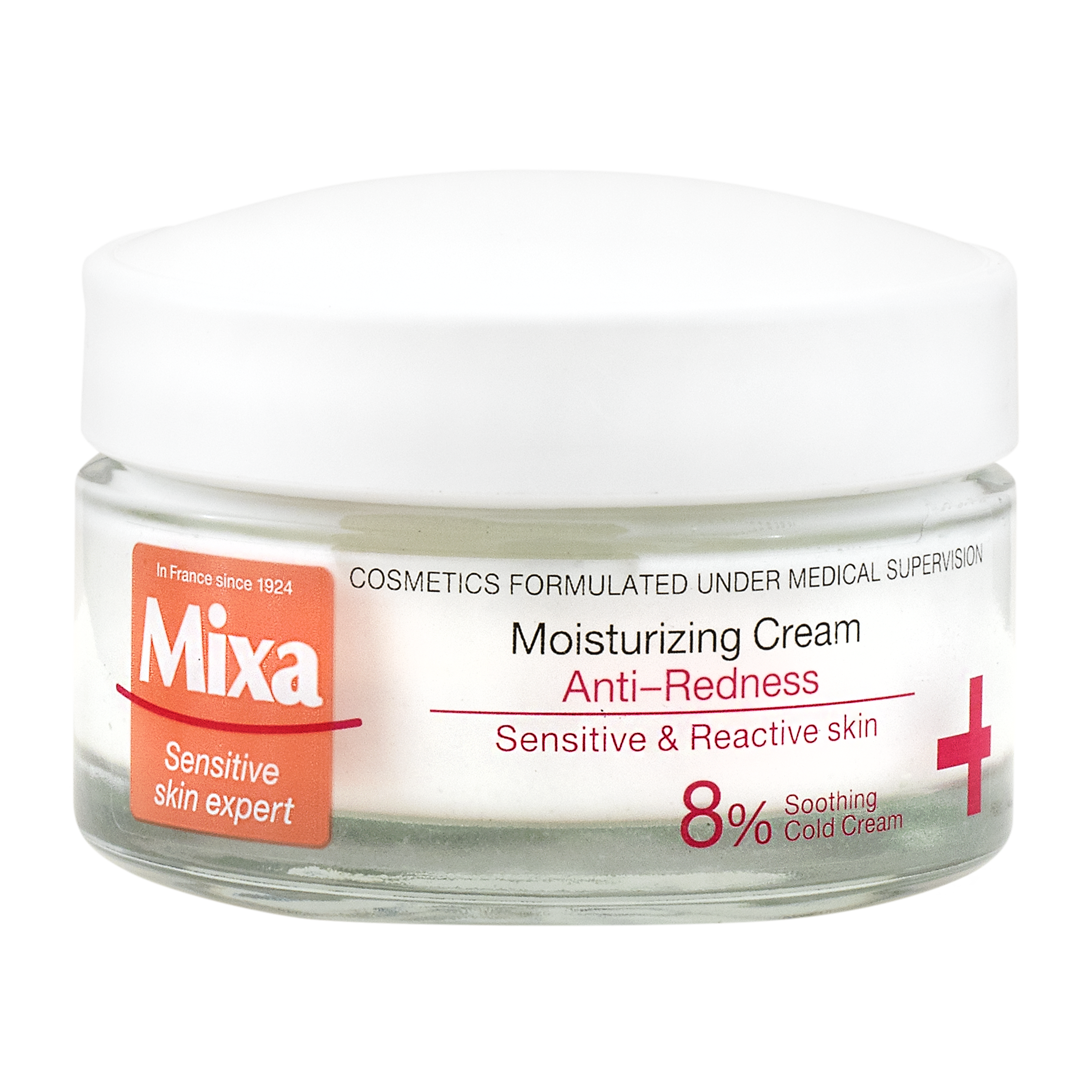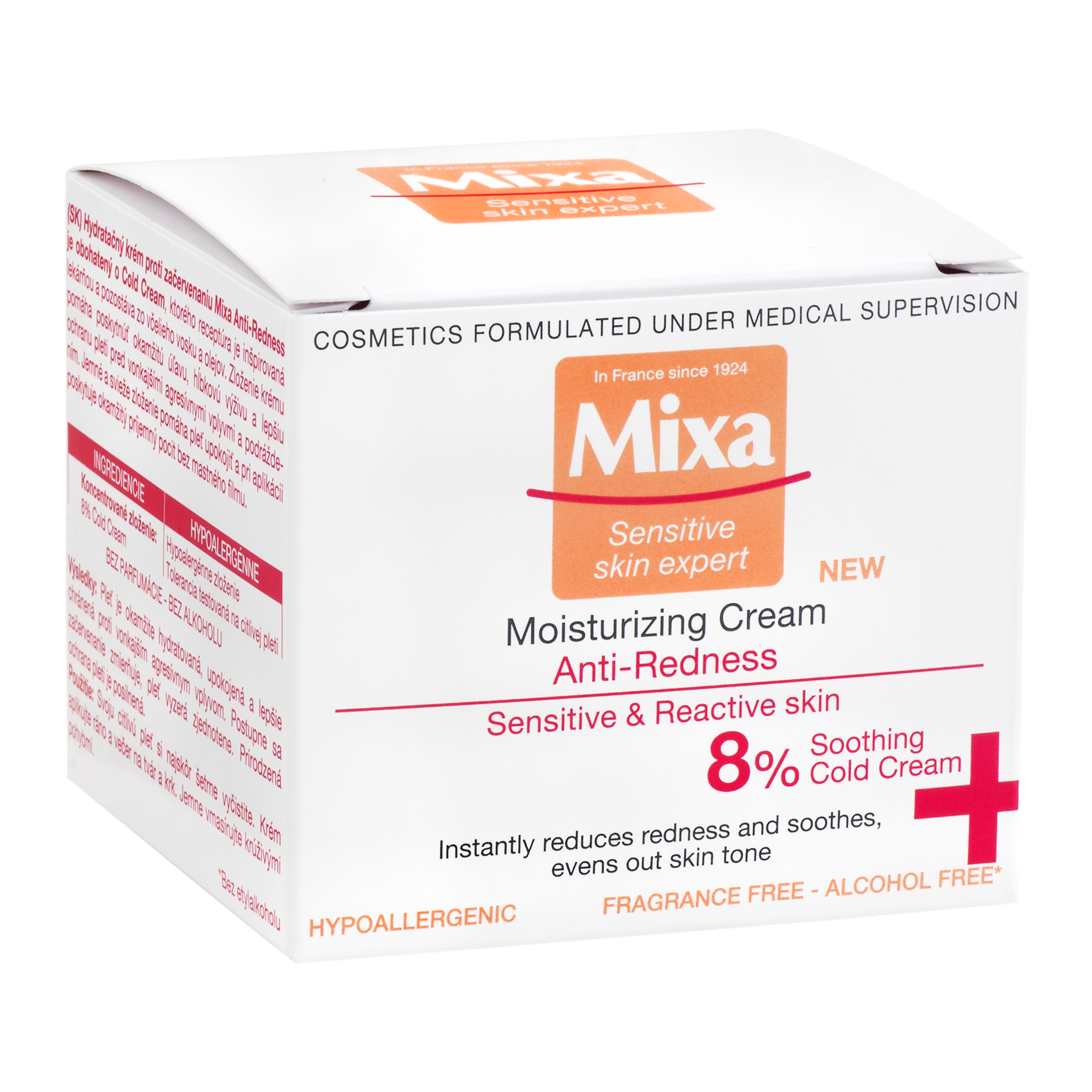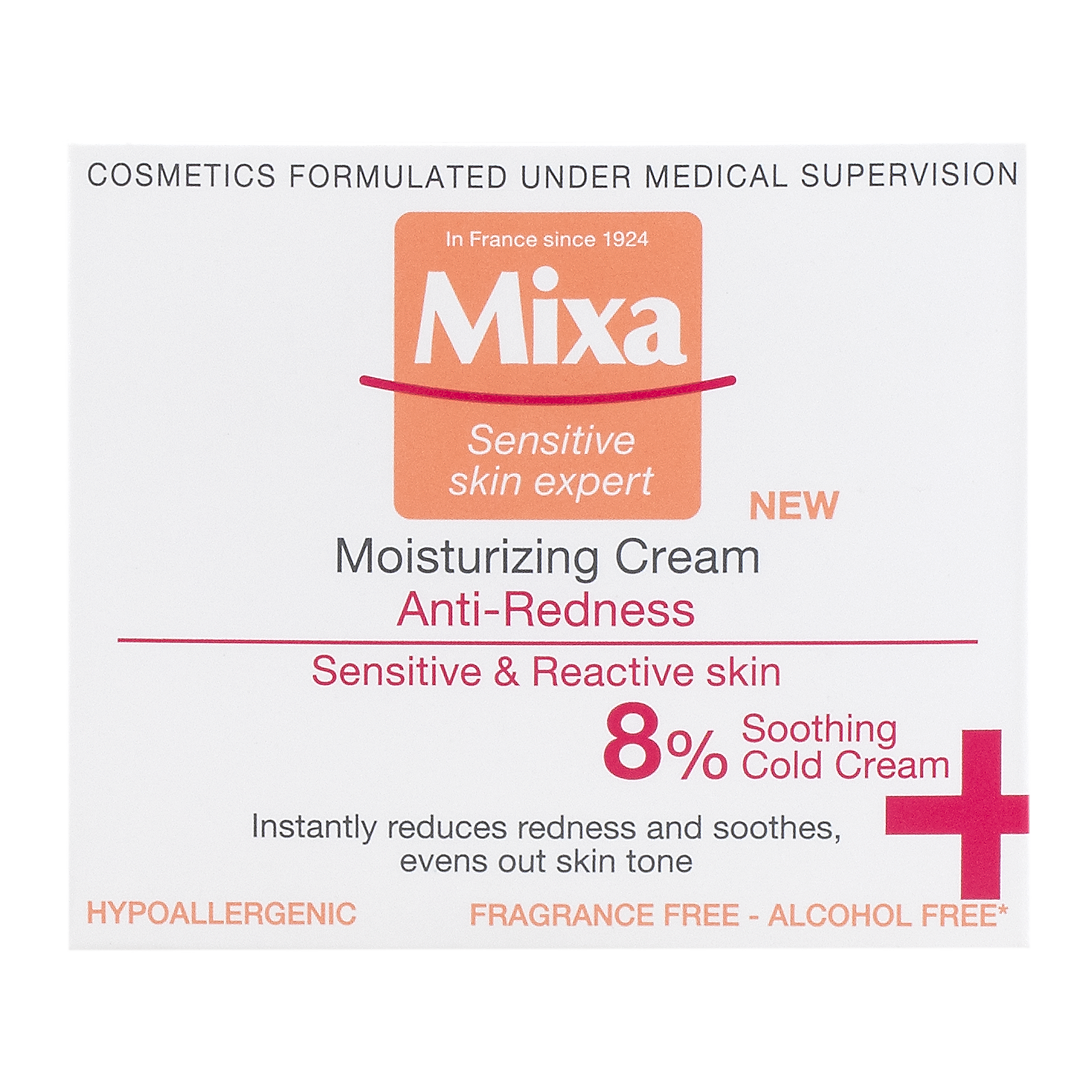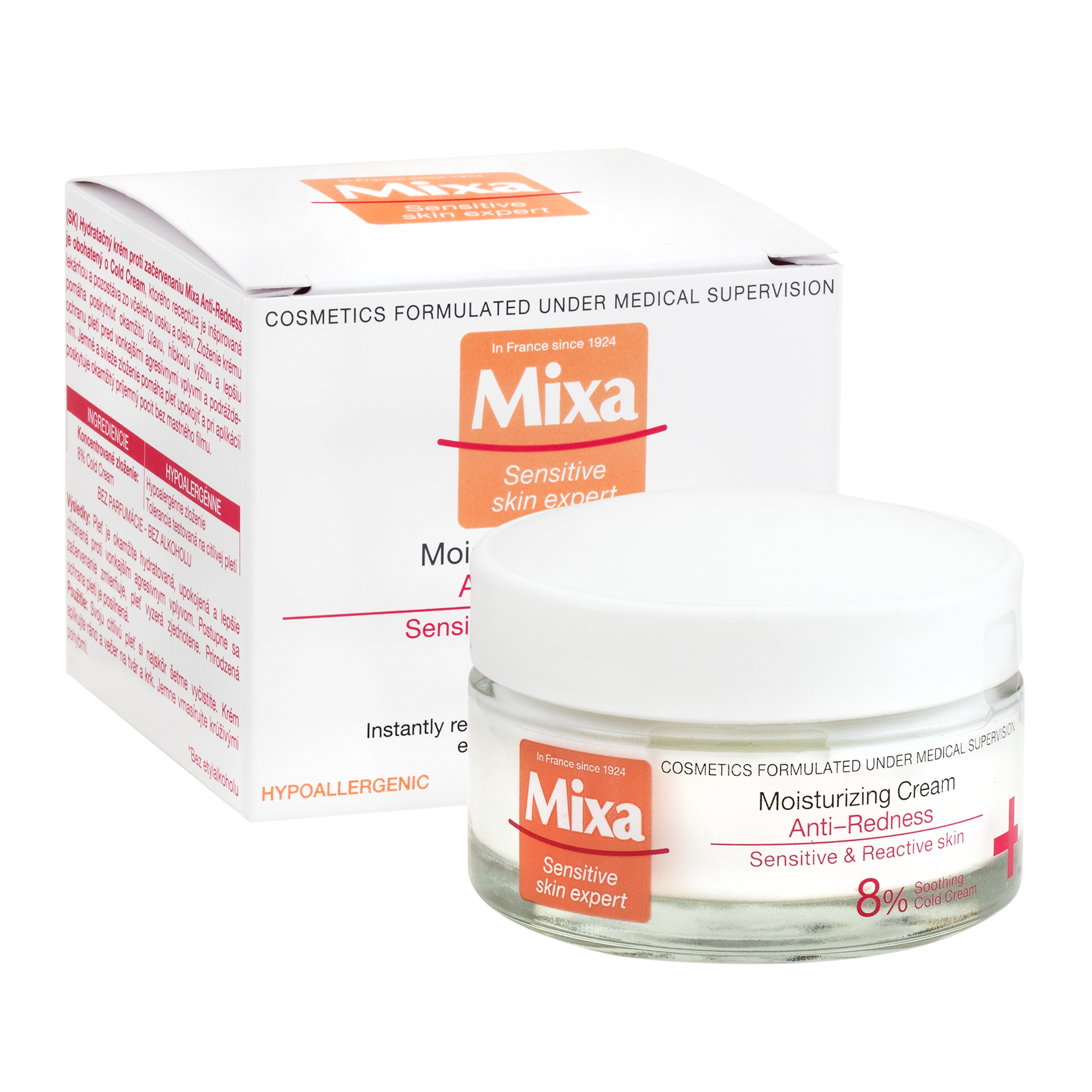 Hydratační krém Mixa Anti-Redness pomáhá redukovat začervenání, zklidnit pleť a sjednotit její tón. Hydratační krém je obohacený o Cold Cream, jehož receptura je inspirovaná farmacií a skládá se ze včelího vosku a olejů. Složení krému pomáhá poskytnout okamžitou úlevu, hloubkovou výživu a lepší ochranu pleti před vnějšími agresivními vlivy a podrážděním.