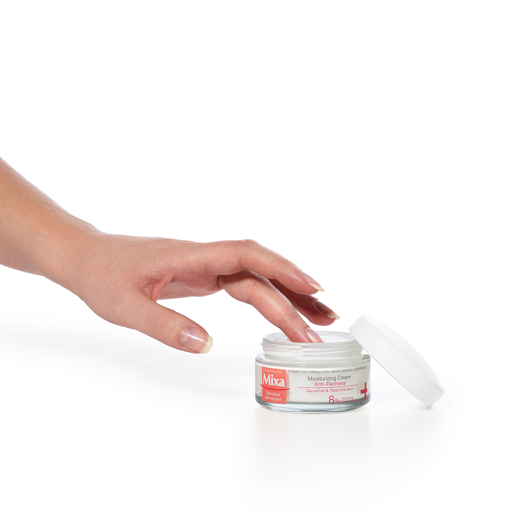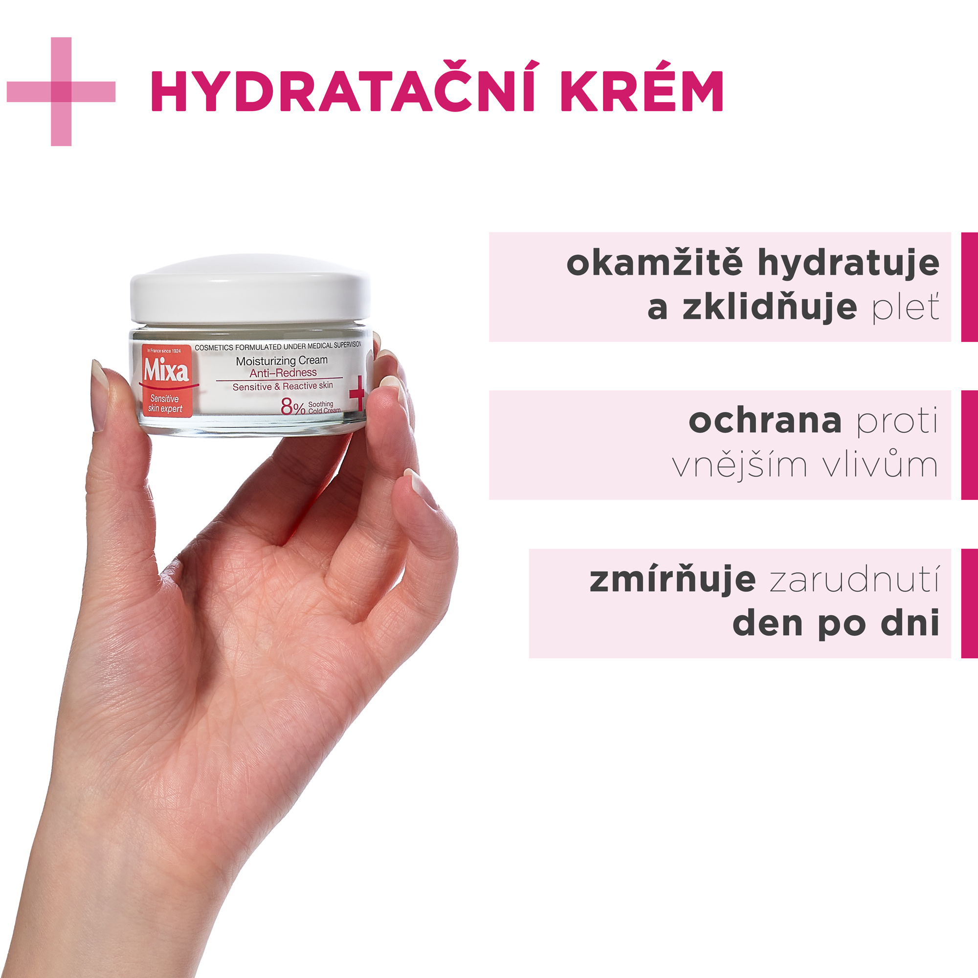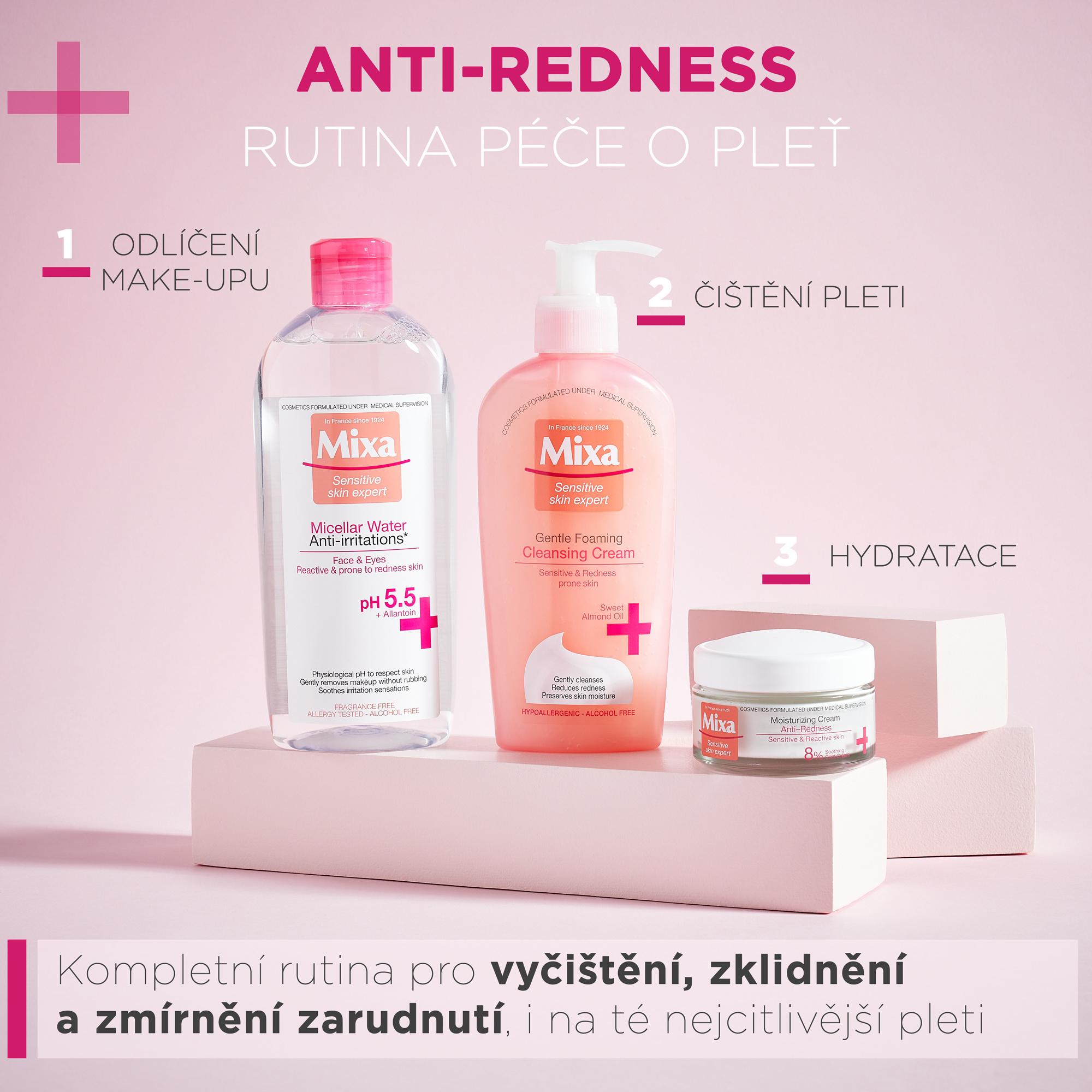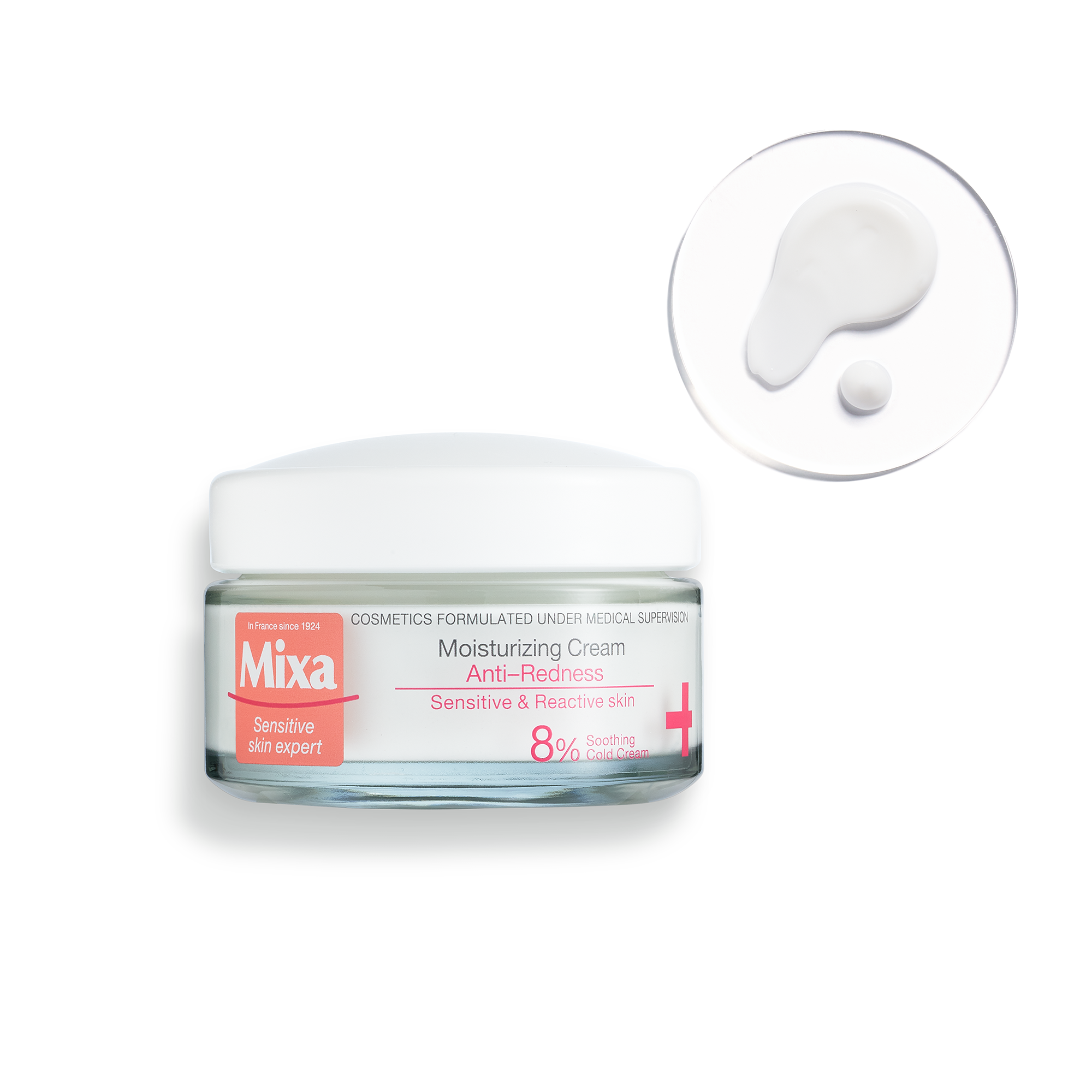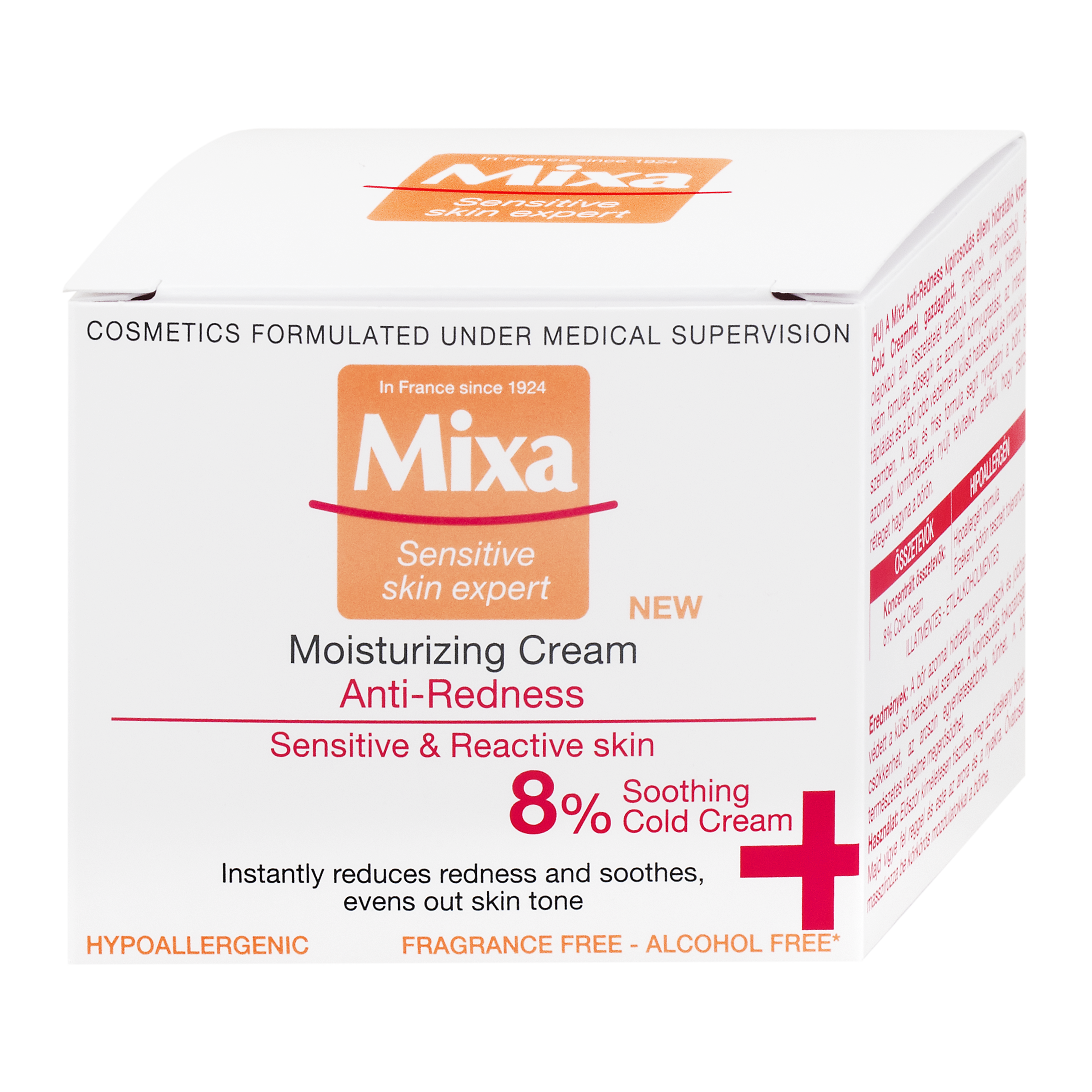 Hydratační krém Mixa Anti-Redness pomáhá redukovat začervenání, zklidnit pleť a sjednotit její tón. Hydratační krém je obohacený o Cold Cream, jehož receptura je inspirovaná farmacií a skládá se ze včelího vosku a olejů. Složení krému pomáhá poskytnout okamžitou úlevu, hloubkovou výživu a lepší ochranu pleti před vnějšími agresivními vlivy a podrážděním.