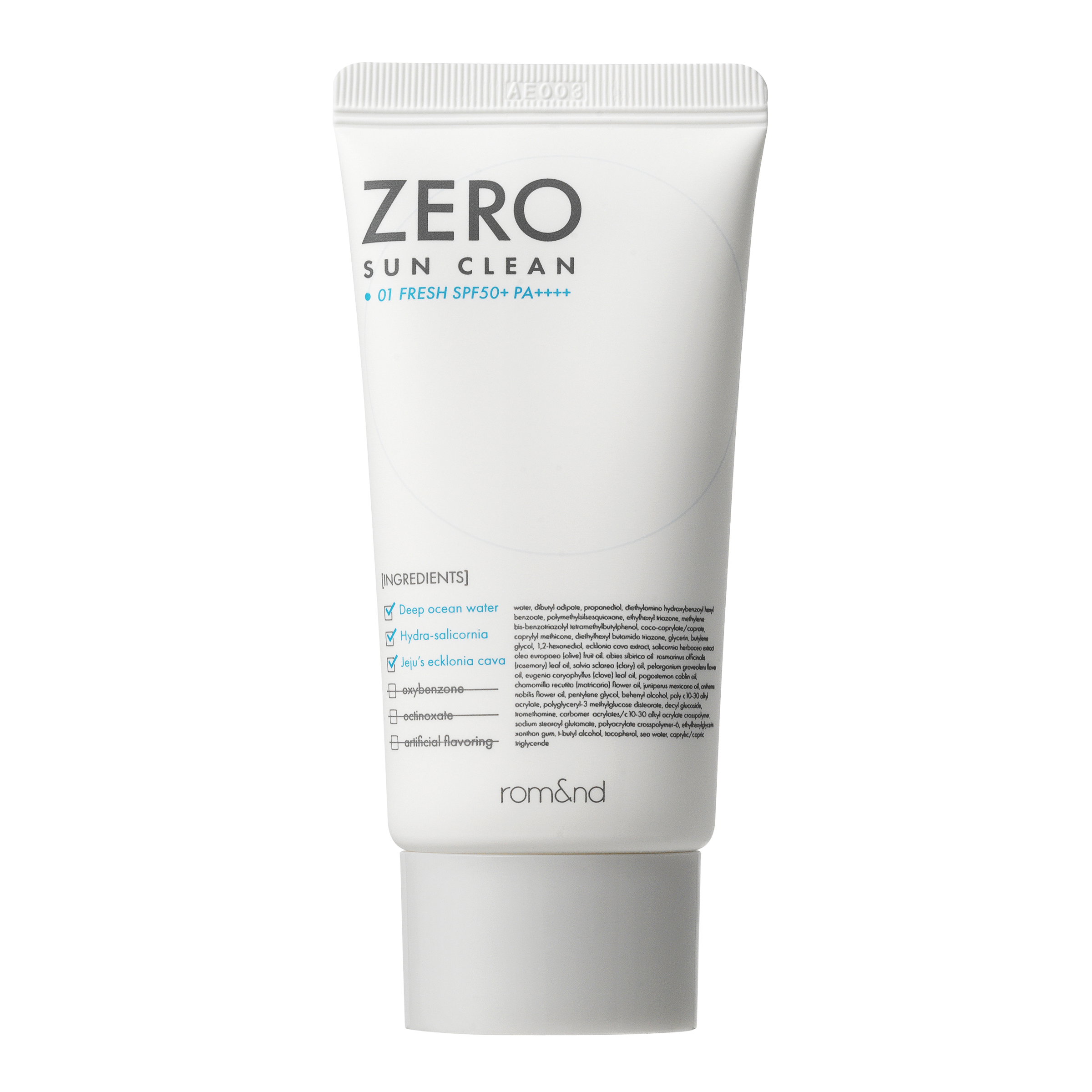 Rom&nd - Zero Sun Clean SPF50+ PA++++ - krém s obsahem chemických filtrů, které zajišťují vysoký stupeň ochrany před UVA a UVB zářením. Přípravek byl obohacen o olivový olej, který vyživuje a vyhlazuje a heřmánkový olej, který zklidňuje. Krém má lehkou, nelepivou konzistenci a nezatěžuje pleť.