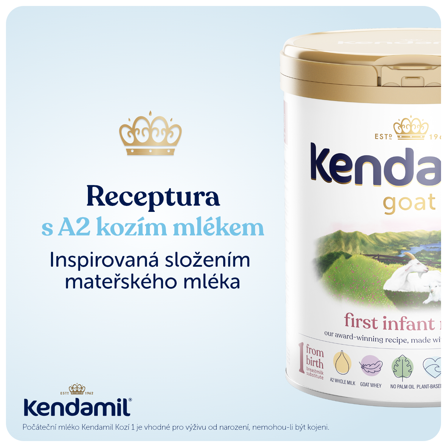 Počáteční kojenecká mléčná výživa Kendamil Kozí, inspirovaná přírodou, je vyrobena z kvalitního plnotučného A2 kozího mléka s obsahem beta-kaseinu – přirozené formy mléčné bílkoviny. Obsahuje pečlivě vybrané složky, včetně HMO+ a oligosacharidů GOS. Určeno pro kojence od narození do ukončeného 6. měsíce, pokud nemohou být kojeni. Certifikováno pro vegetariány.