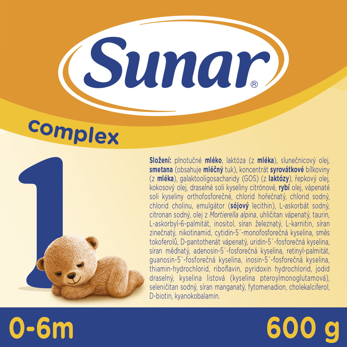Sunar Complex 1 je počáteční kojenecké mléko z plnotučného mléka, bez palmového oleje. Vyvinuto podle vzoru mateřského mléka. Je určeno pro miminka od narození a obsahuje unikátní kombinaci látek přirozeně se vyskytujících v mateřském mléce. Počáteční mléčná kojenecká výživa pro spokojené bříško. Kojení je pro kojence nejlepším způsobem výživy během prvních měsíců života. Pokud však kojení není možné, Sunar Complex 1 nabízí první náhradní kojenecké mléko, které je inspirováno složením mateřského mléka a splňuje veškeré požadavky na výživu kojence od narození do ukončeného 6. měsíce života. Plnotučné mléko, ze kterého je Sunar Complex 1 vyroben, dodává mléku lahodnou chuť a proto je dětmi velmi dobře přijímáno a mají spokojené bříško.