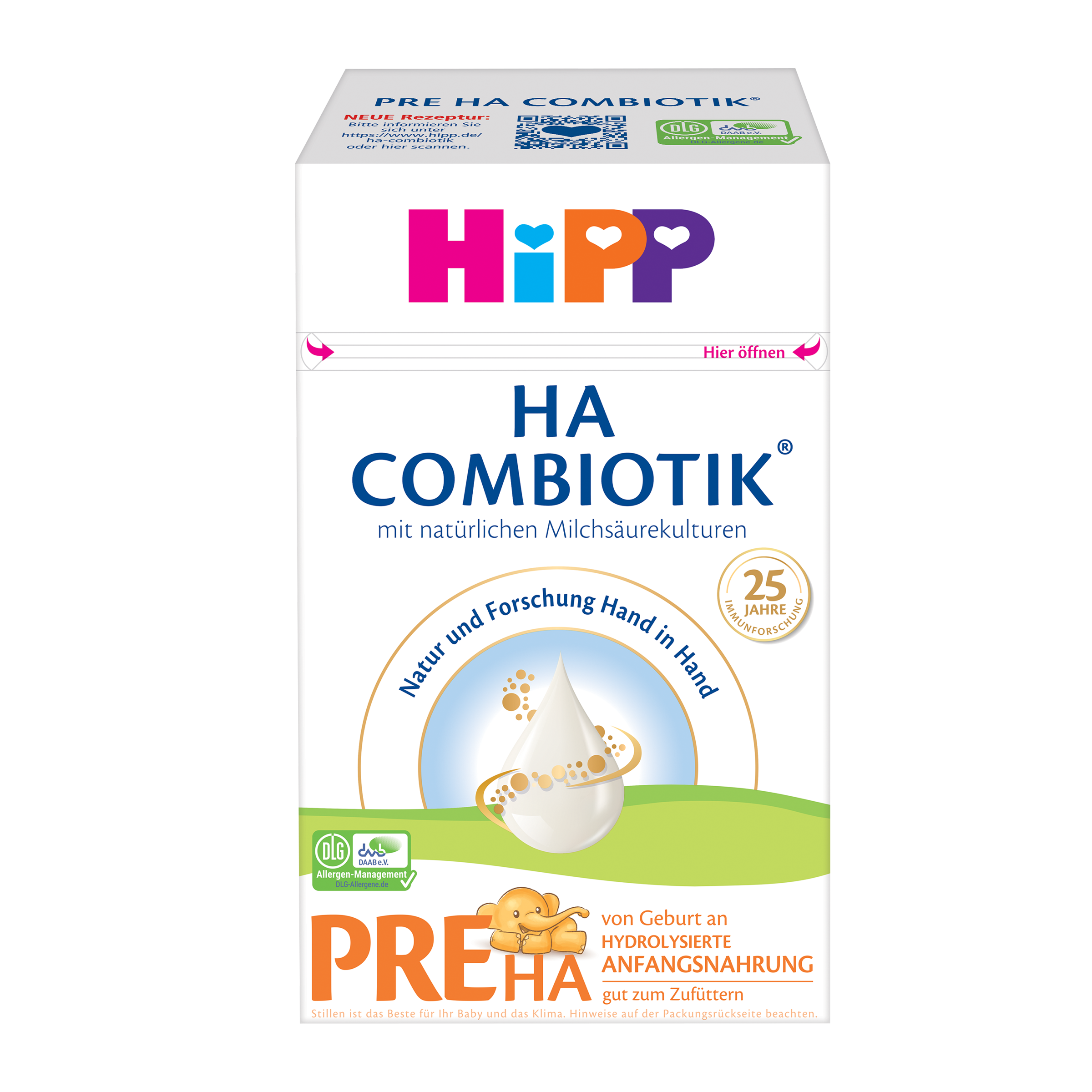 Speciálně vyvinuté složení s jemně naštěpenou (hydrolyzovanou) bílkovinou a unikátní kombinací cenných ingrediencí je obzvláště šetrné k citlivému imunitnímu systému Vašeho dítěte. Speciální počáteční kojenecká mléčná výživa HiPP HA1 Combiotik® je lehce stravitelná a dobře zasytí. Lze ji podávat od narození. Receptura je nově upravena: obsahuje z cukrů pouze laktózu.