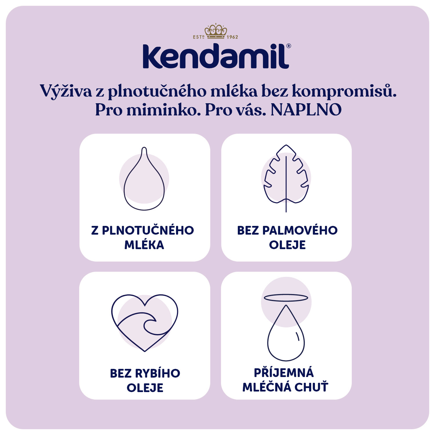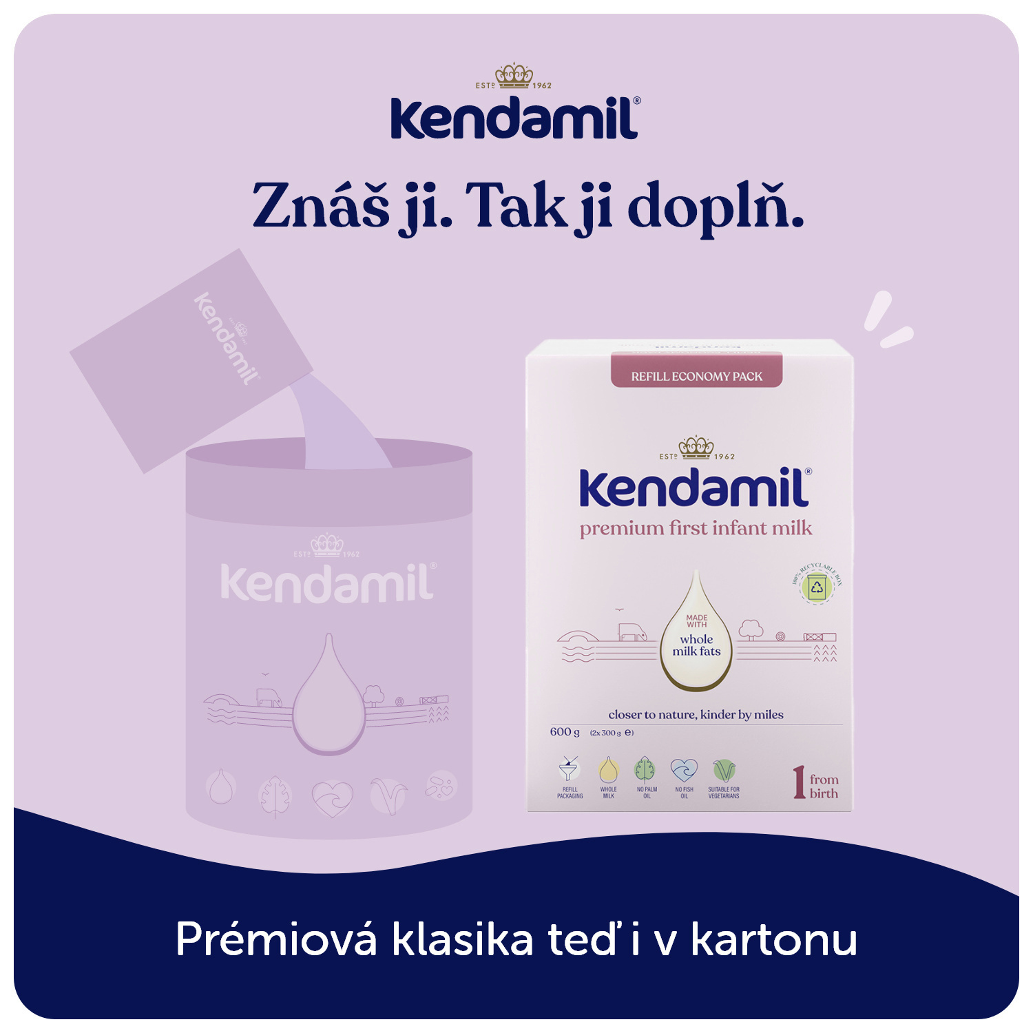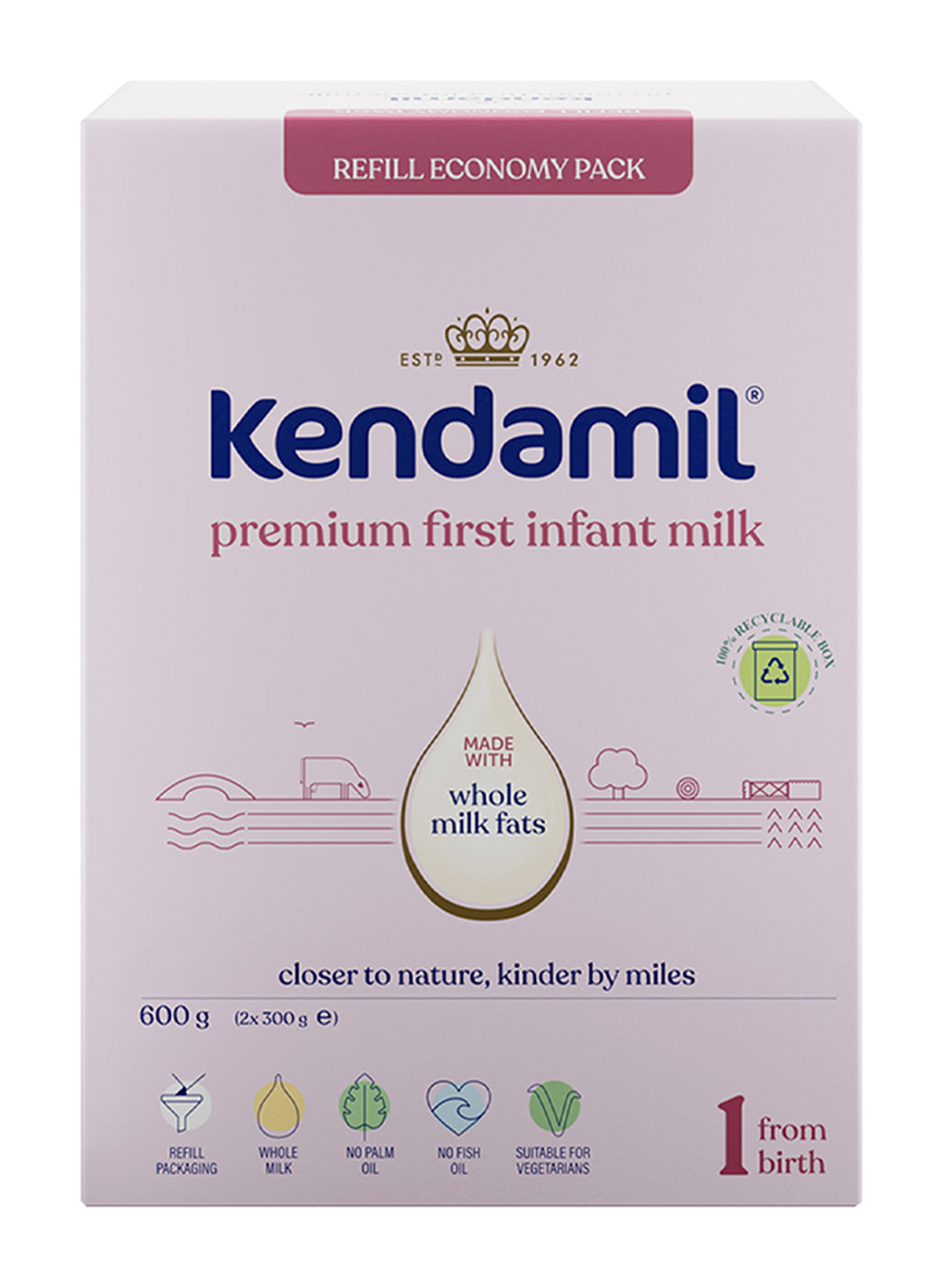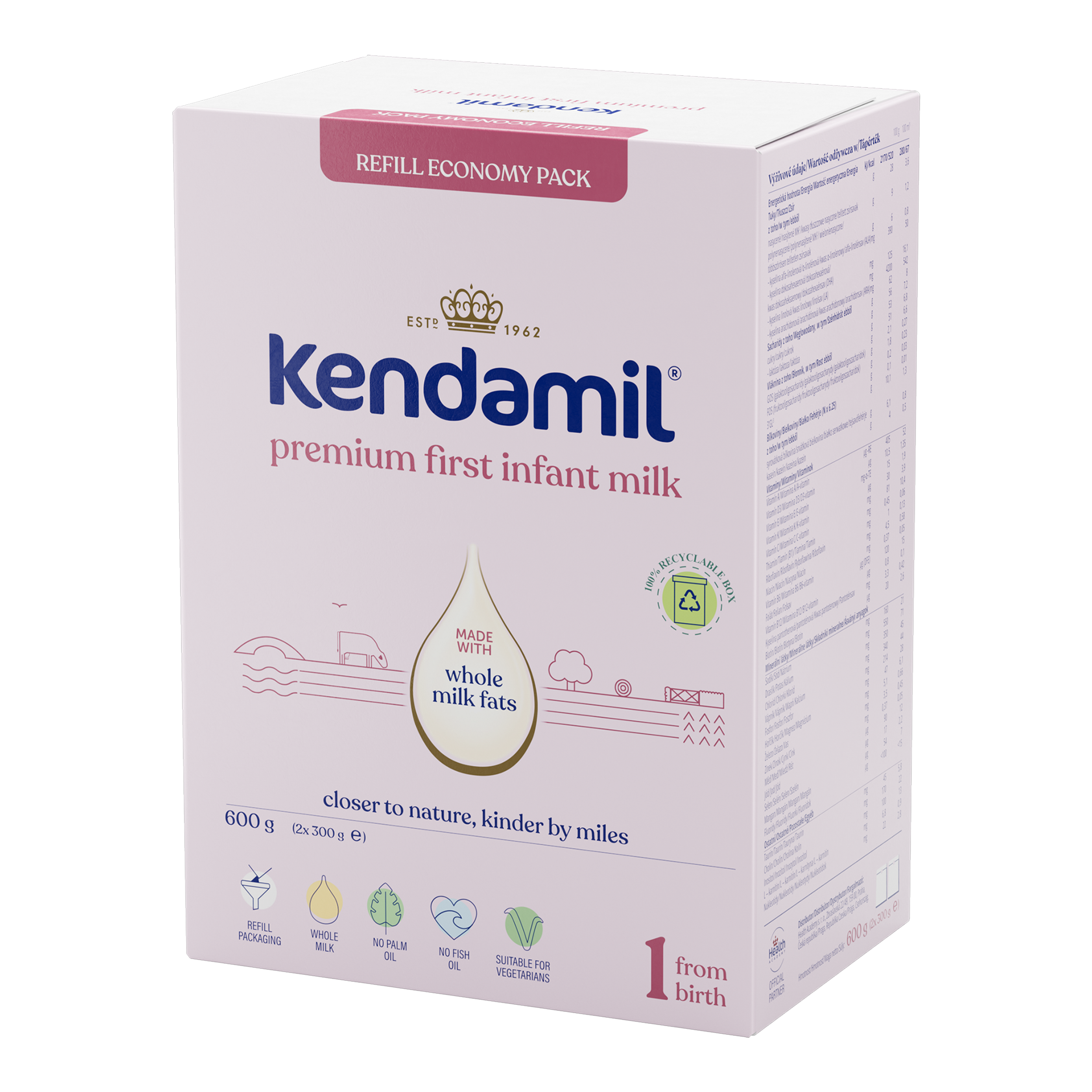 Počáteční mléčná kojenecká výživa v prášku. Potravina pro výživu kojenců od narození, pokud nemohou být kojeni. Nová vylepšená receptura tohoto mléka vznikla na základě 60letého výzkumu a vývoje. Kojenecké mléko Kendamil je inspirováno tím nejlepším z přírody. Jeho základ tvoří především plnotučné kravské mléko. Určeno pro miminka od narození do ukončeného 6. měsíce, pokud nemohou být kojena.