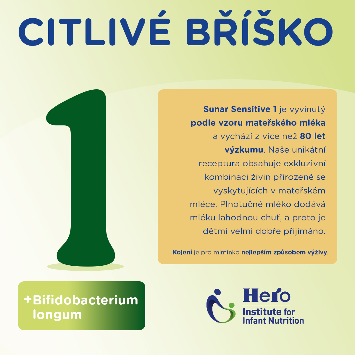Sunar Sensitive 1 je kojenecká mléčná výživa s probiotiky pro miminka od narození, určena pro citlivé bříško vašeho děťátka. Jedná se o unikátní kombinaci látek¹ podle vzoru mateřského mléka s obsahem bakterií Bifidobacterium longum, které se přirozeně nacházejí ve střevním mikrobiomu kojených dětí. Počáteční mléčná kojenecká výživa s probiotiky pro spokojené bříško. Probiotické bakterie Bifidobacterium longum se přirozeně nacházejí ve střevním mikrobiomu kojených dětí. Kojení je pro kojence nejlepším způsobem výživy během prvních měsíců života. Pokud však kojení není možné, Sunar Sensitive 1 nabízí první náhradní kojenecké mléko, které je inspirováno složením mateřského mléka a splňuje veškeré požadavky na výživu kojence od narození do ukončeného 6. měsíce života. Plnotučné mléko, ze kterého je Sunar Sensitive vyroben, dodává mléku lahodnou chuť, a proto je dětmi velmi dobře přijímáno a mají spokojené bříško.